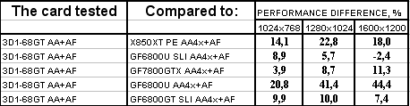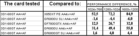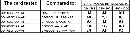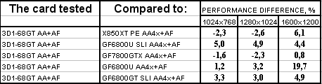 А тут мы можем видеть некоторый парадокс: 3D1-68GT чуть-чуть, но обошла 6800Ultra SLI! С чем это связано? Полагаю, что могут быть две причины: тайминги по памяти понижены (а поскольку данный тест весьма сильно зависит от ПСП, то это повлиять могло), более грамотная реализация внутреннего адаптера SLI.