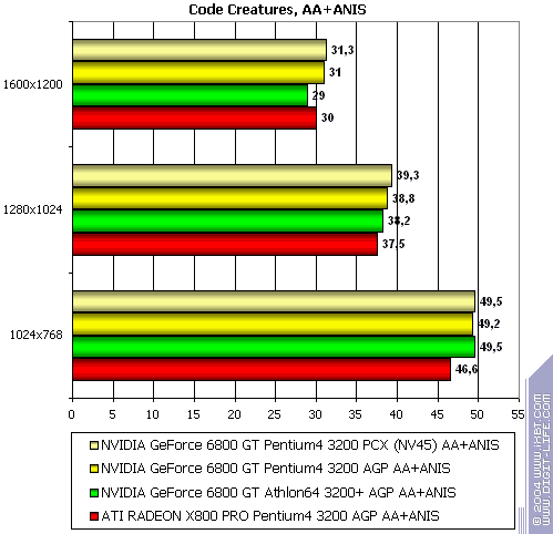 Итоговый самый тяжелый режим с АА и анизотропией: поражение NV45 перед NV40, но выигрыш у X800 PRO.