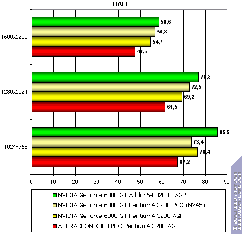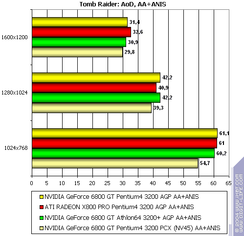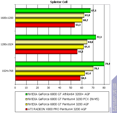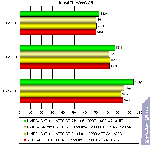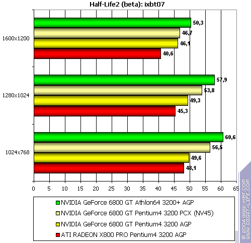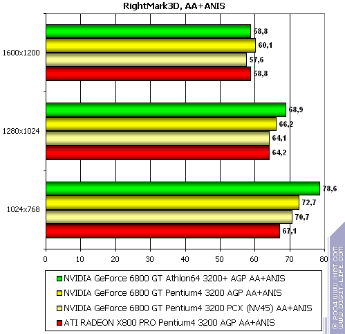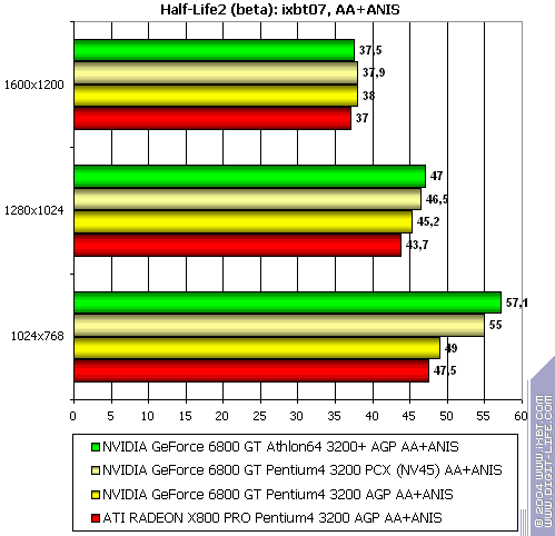 - NVIDIA GeForce 6800 GT PCI-E (NV45) против ATI RADEON X800 PRO AGP — аналогично
