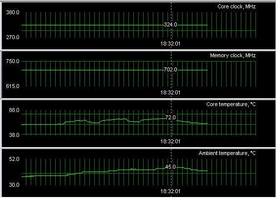 Как видим, штатная система охлаждения отлично справляется со своей работой. А что касается разгона, то у данного экземпляра потенциал просто отменный, ведь память не 2.8, а 2.5 нс! И потому при наличии обдувающего карту вентилятора мы могли получить устойчивую работу на частотах 420/900(!) МГц.