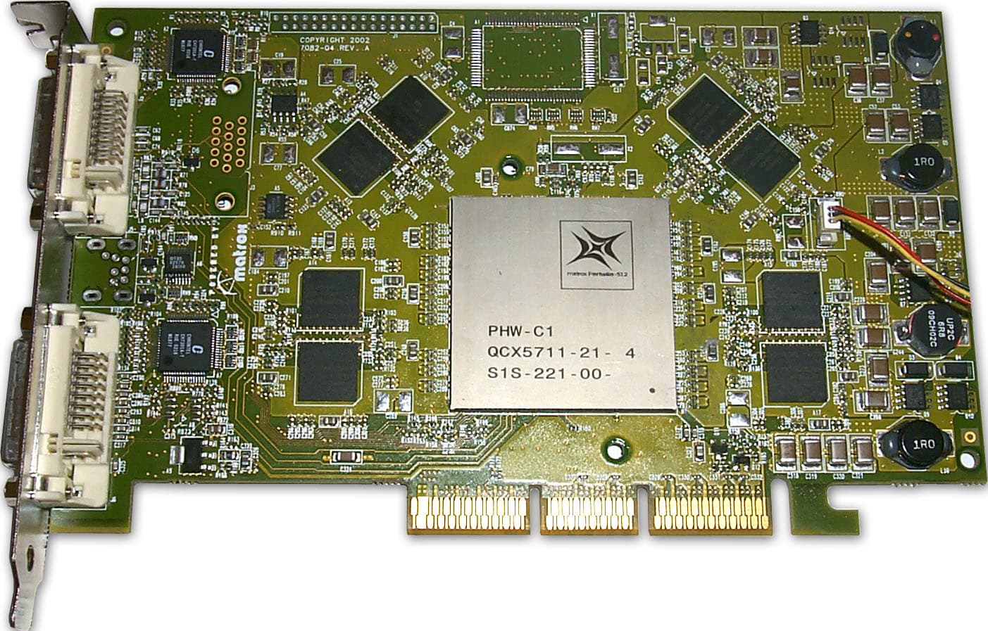 - Parhelia 128MB (OEM) — 200 МГц ядро, 128 МБ 250(500) МГц 256 бит DDR памяти.