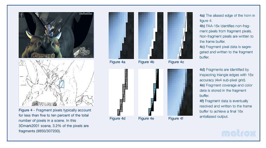 Рекомендую еще раз почитать наш аналитический материал по Matrox Parhelia, где доступно описан новый метод АА, предлагаемый Matrox. По своей сути это суперсэмплинг, до 16 отсчетов на одну точку экрана. Но, выполняется он ТОЛЬКО (!) для точек принадлежащих краям полигонов (всего 3..5% типичной сцены):