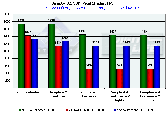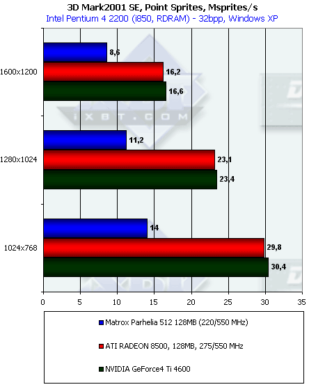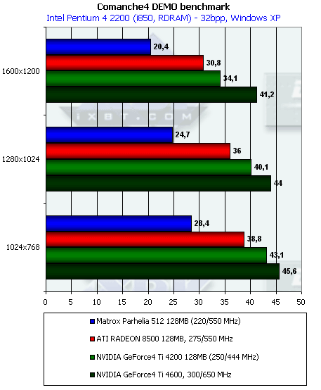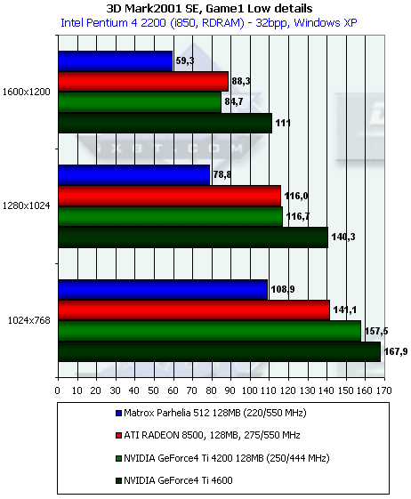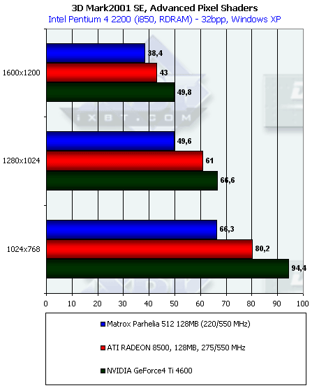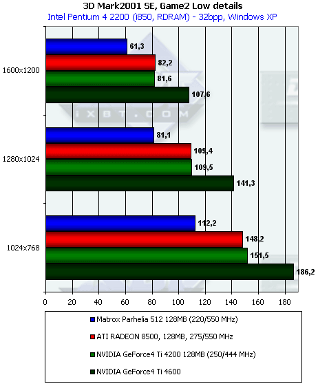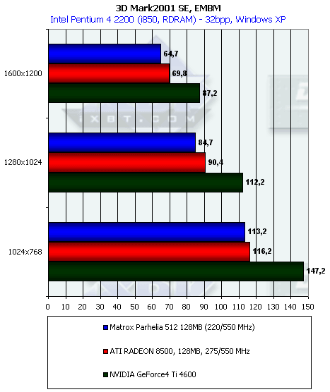 На основании общих "марков" можно отметить, что Parhelia отстала от всех соперников. Проиграла даже Ti 4200. А теперь посмотрим более подробно.