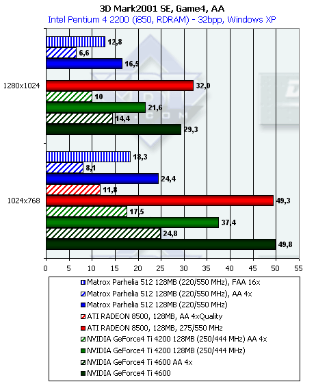 А в данном тесте Parhelia не помогло и включение FAA 16x, скорость очень низкая. Впрочем, сам этот тест весьма сложен, хотя компания ATI в свое время смогла как-то найти способ оптимизации работы своих карт в Game4, с тех пор этот тест — "королевский" для RADEON 8500.