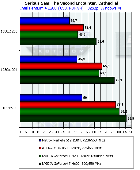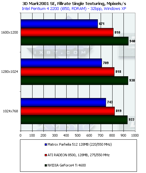 Отставание у Parhelia в разрешении 1600х1200х32 таково: от Ti 4600 — 41%, от Ti 4200 — 21.6%, от RADEON 8500 — 26.6%.