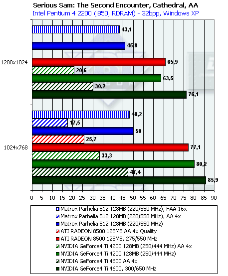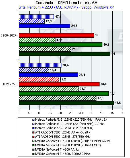 Результаты для Parhelia просто катастрофичны! И даже FAA не помогает карте догнать лидера. Впрочем, Ti 4200 при AA4x в 1280х1024 все же проиграл, но это даже не серьезно.