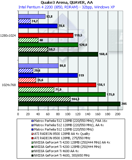 Отставание у Parhelia в разрешении 1600х1200х32 таково: от Ti 4600 — 46.7%, от Ti 4200 — 30%, от RADEON 8500 — 32.8%.