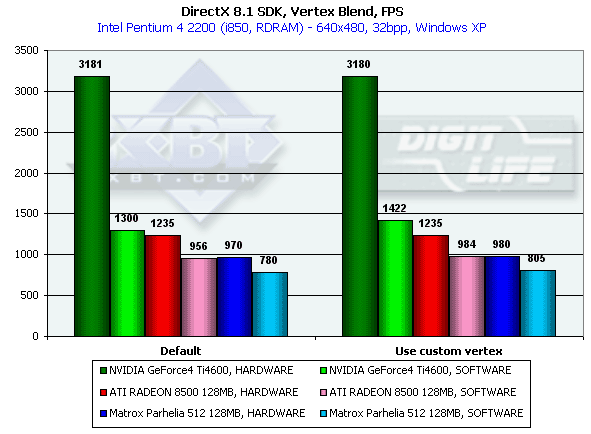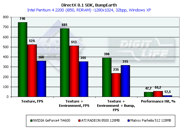 Учитывая особенность работы этого теста с RADEON 8500 (см. 3DGiТоги), мы провели этот тест на стенде на базе VIA KT333 (Athlon XP). Известно, что это приложение активно использует вершинные шейдеры. А что мы имеем у Parhelia? Снова проигрыш везде. Увы.