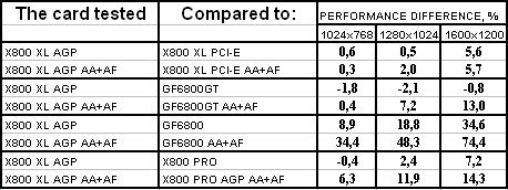 Ситуация аналогичная. Хотя надо сказать, что разница платформ внесла некоторые колебания дельты скоростей между X800 XL AGP и X800 XL PCI-E.