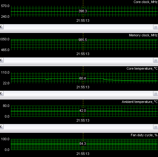 Как видим, все в пределах нормы, проблем с перегревом нет. Для мониторинга использовалась утилита RivaTuner (автор А.Николайчук AKA Unwinder).