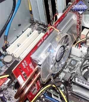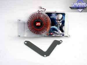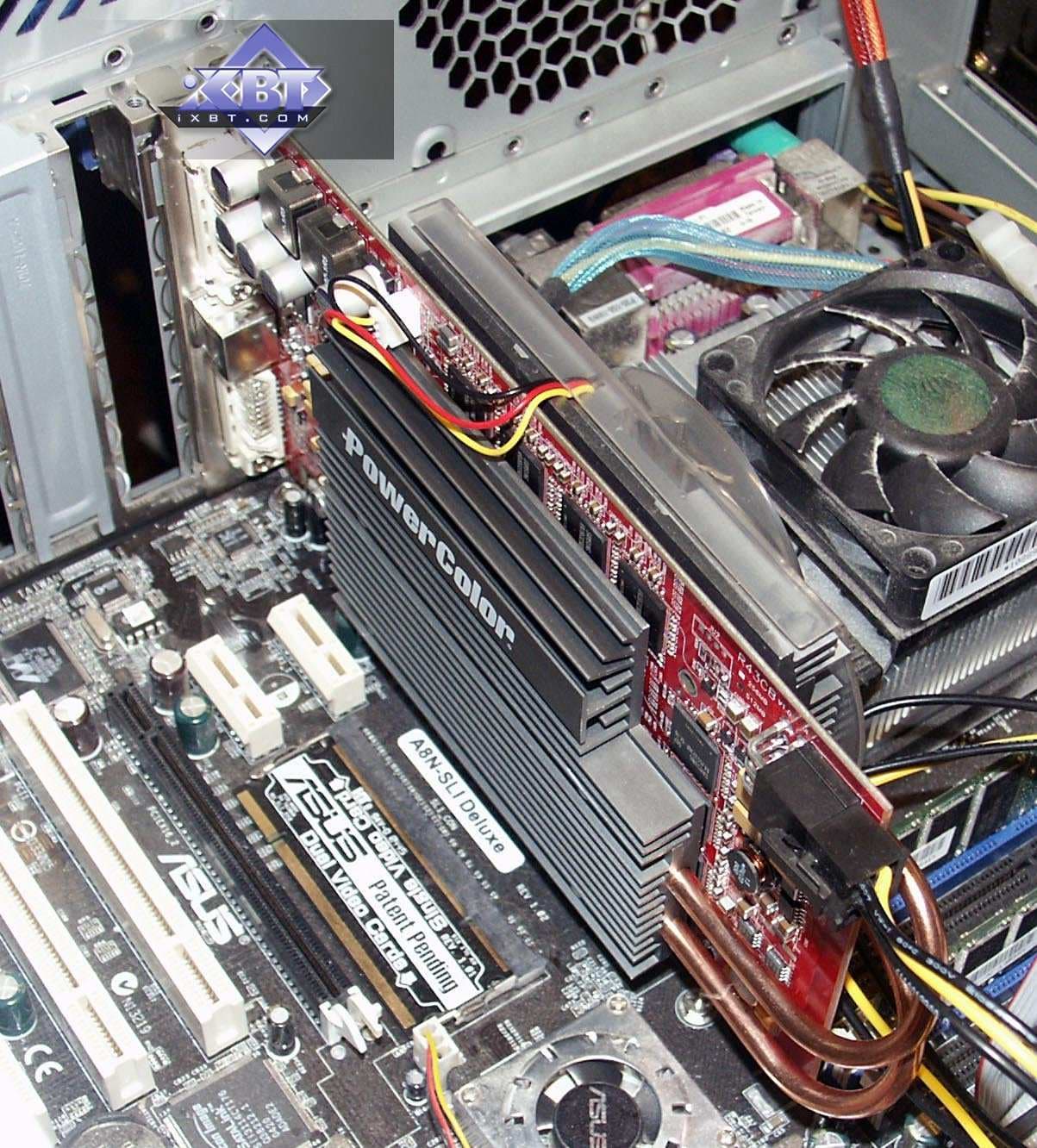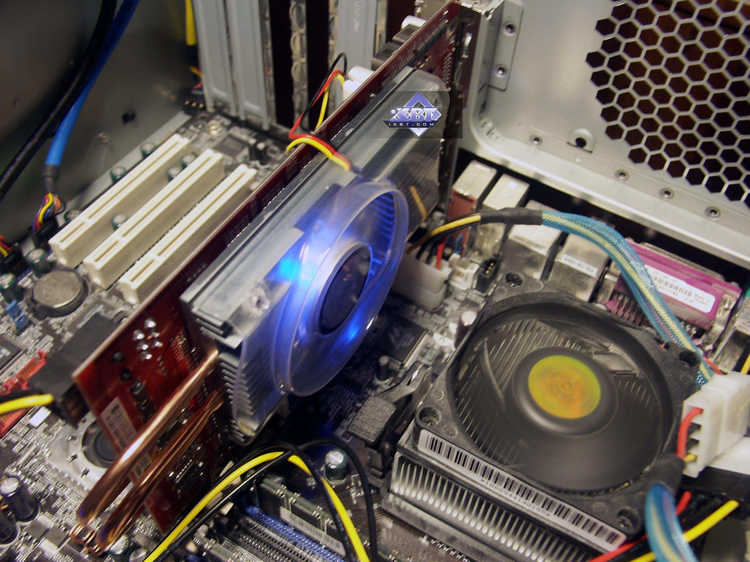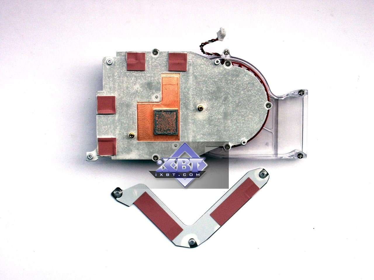 Мы уже сталкивались с подобным устройством, выдвинутым PowerColor, на примере карты на базе X700 XT. Система охлаждения представляет собой два массивных радиатора, размещенных по обеим сторонам PCB и соединенных между собой тепловыми трубками с легкокипящей жидкостью внутри. В отличие от предшественника, в данном случае вентилятор установлен на заднем радиаторе (впрочем, для X700 XT вентилятор вовсе не обязателен). Учитывая размеры устройства и охлаждающие площади, для отсутствия перегрева GPU достаточно малооборотистого вентилятора, поэтому шума от него практически нет (опять же, на видеоролике это все видно). Около вентилятора имеется подсветка, поэтому любители моддинга будут довольны, к тому же, она находится с оборотной стороны карты, а следовательно в системном блоке будет сверху (а не традиционно внизу, откуда красивости все не видны). | ![]() |