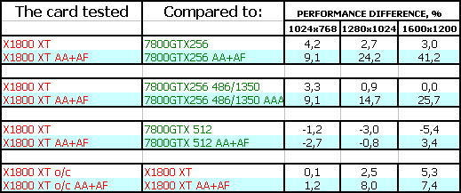 Ситуация аналогичная, только если сравнивать X1800 XT с GeForce 7800 GTX 256MB разных ценовых калибров, то первый выигрывает почти везде. Проигрыш 512-мегабайтному 7800 GTX — болезненнее, но не ужасен, так как цена последнего все же выше.
