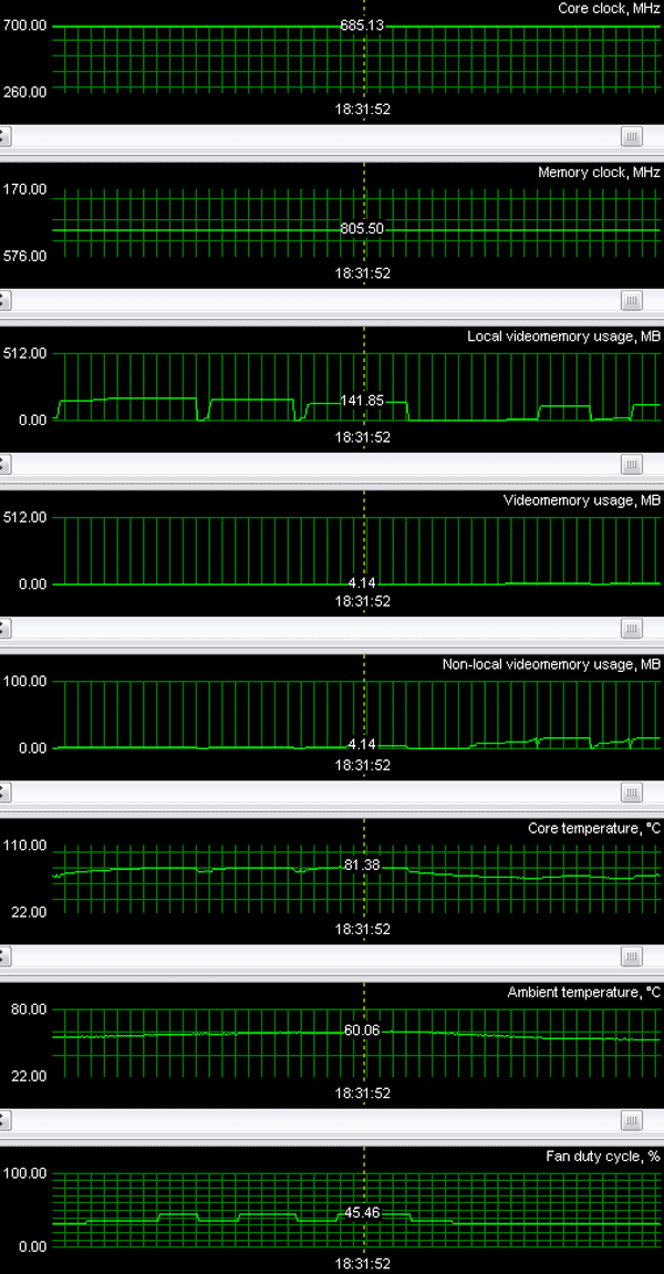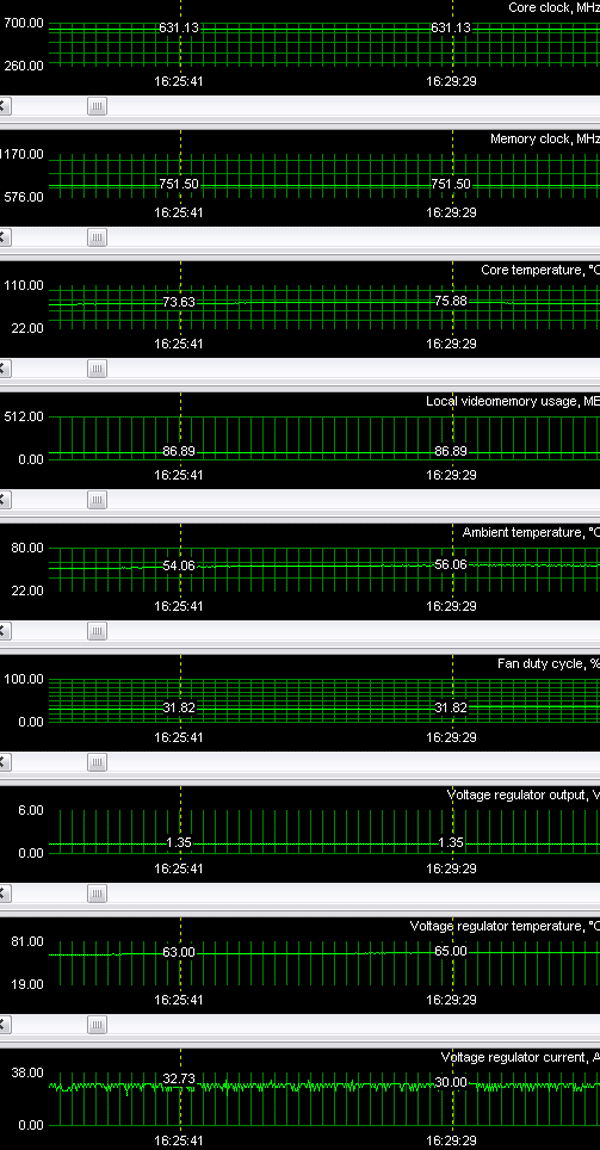 Как мы видим, напряжение ядра при нагрузке составляет 1.35В. Токи достигают величин вплоть до 35А, что позволяет констатировать, что потребляемая самим GPU мощность будет примерно до 48Вт. Опять-таки, сравнивая с общим потреблением карты, можно сделать вывод, что GPU берет на себя чуть меньше половины всего энергопотребления ускорителя, остальное приходится на память и сопутствующие траты. Также стоит отметить эффективность системы охлаждения, которая без роста числа оборотов кулера не дает ядру нагреться более чем на 75-76 градусов.