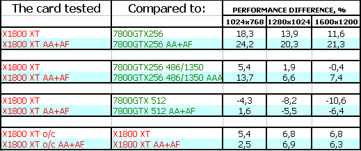 А здесь все логично и правильно, как в Конституции. X1800 XT выиграл битву у всех 256-меговых 7800 GTX, проиграв лишь 512-меговой карте.