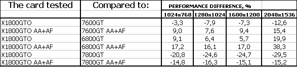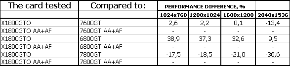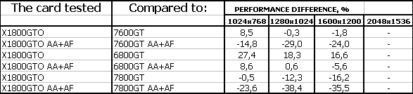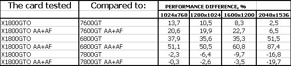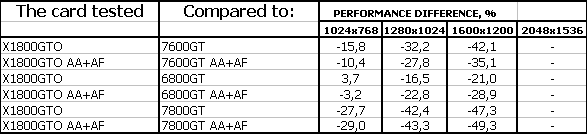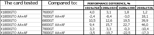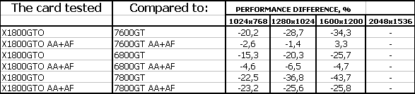 Эта игра, в отличие от F.E.A.R., обеспечивает прекрасную играбельность даже с АА+АФ, поэтому будем ориентироваться на эти данные, а по ним выходит, что X1800 GTO также в проигрыше.
