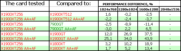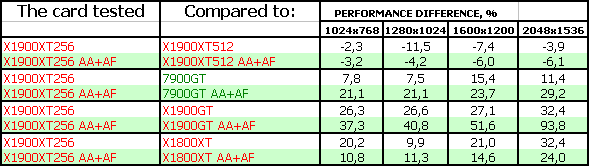 Однако я хочу еще раз отметить, что у семейства X1xxx есть очень важное преимущество: поддержка HDR вместе с АА, а для топовых карт это очень важно, скорости таковы, что этот вариант грех не применять. Чего не могут физически продукты от NVIDIA. Плюс более качественная анизотропная фильтрация. Также есть мнение, что по умолчанию с использованием всех оптимизаций качество у NVIDIA-карт хуже, чем у ATI. А при выключении оптимизаций, повышая качество, ускорители на процессорах от NVIDIA сильно теряют в скорости. Возможно, мы проведем в ближайшее время это расследование и изучим, что у нас с качеством, поскольку в последний раз это делали год назад.
