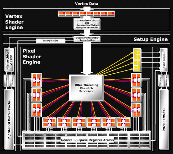 Архитектура пиксельной части отличается от применяемой основным конкурентом тем, что текстурные модули вынесены за общий конвейер. Здесь нет общего длинного конвейера, по которому «крутятся» квады, текстурная часть существует отдельно — блоки генерации текстурных координат и доступа к текстурам и сами TMU, а отдельно — пиксельные процессоры, выполняющие арифметические операции, и наборы регистров с данными. Специальный Ultra Threading Dispatch Processor управляет исполнением — в обработке одновременно находится 512 квадов, каждый из которых может быть на разных стадиях исполнения шейдера. Вместе с каждым квадом хранится его текущее состояние, команда шейдера, значения ранее проверенных условий. Процессор постоянно проверяет наличие свободных ресурсов: текстурных и пиксельных блоков и направляет стоящие на очереди квады в освободившиеся устройства. Если квад не прошел проверку на условие и не должен обрабатываться той или иной частью шейдера, он пропустит ненужные команды, и не будет занимать работой текстурный или пиксельный блок. Если квад ждет данных из текстурного блока — он пропустит вперед другие квады, которые загрузят пиксельные вычислительные блоки.
