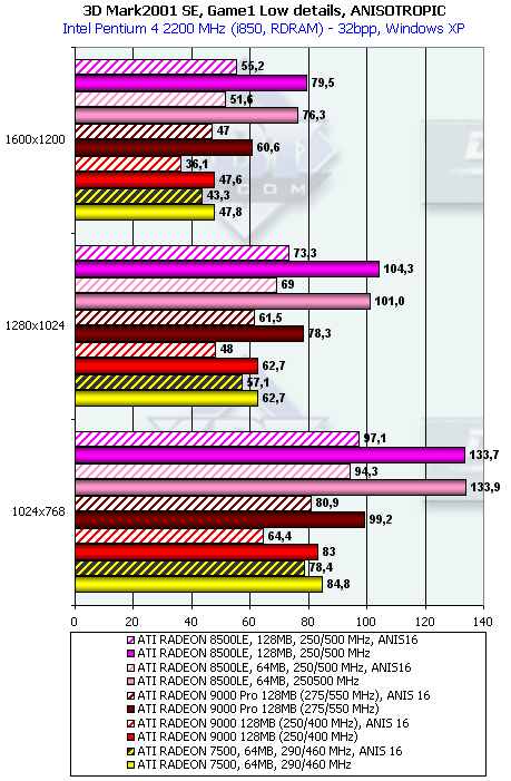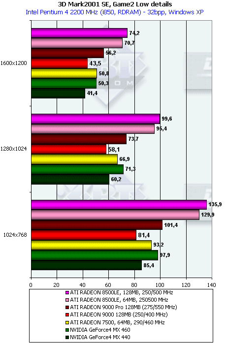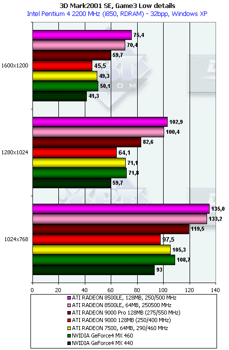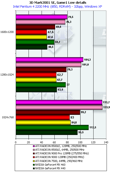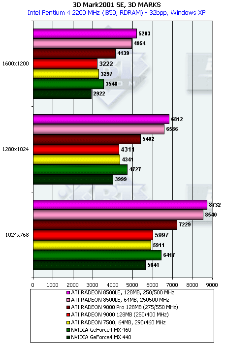 Ну прямо интересное соответствие производительностей: RADEON 9000 — GeForce4 MX 440, RADEON 9000 Pro — GeForce4 MX 460. Ну и конечно, все они отстали от сладкой парочки RADEON 8500 64 и 128 MB.