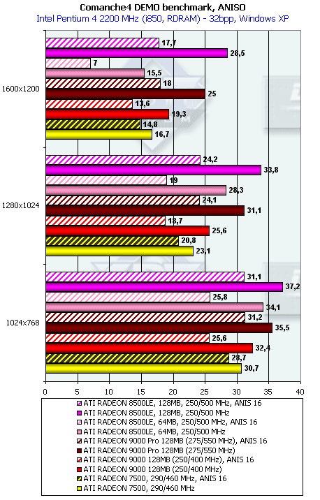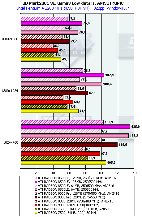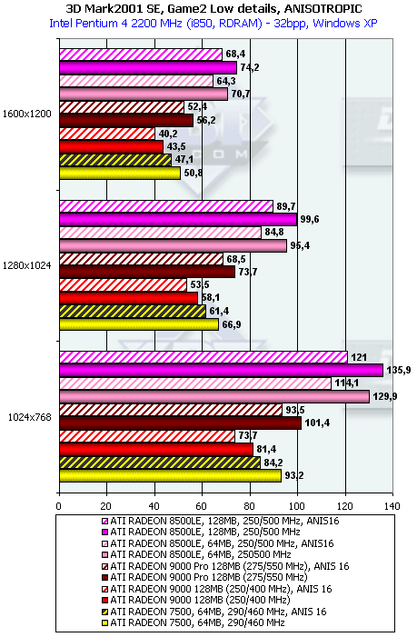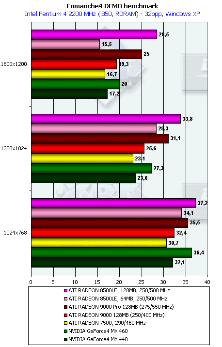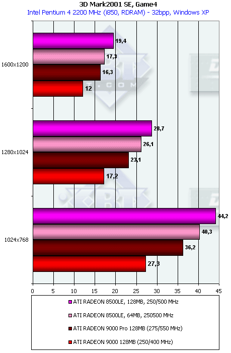 А в этом тесте оба RADEON 9000 обогнали каждый "своего соперника". А разницы между 64- и 128-мегабайтными картами по-прежнему нет (имеется в виду скорость, конечно, а не цена :-).