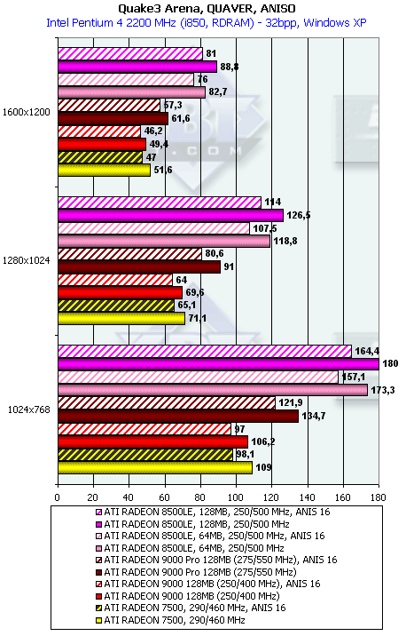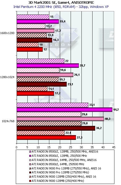 Тесты RADEON 9000 были сняты путем понижения частоты Hercules 3D Prophet 9000 Pro до 250/400 МГц.