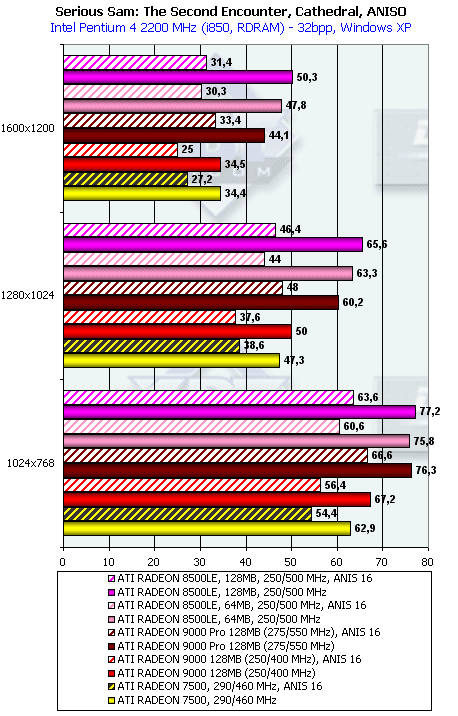 - Serious Sam: The Second Encounter v.1.05 (Croteam/GodGames) — OpenGL, мультитекстурирование, Grand Cathedral demo, настройки тестирования: quality, S3TC OFF