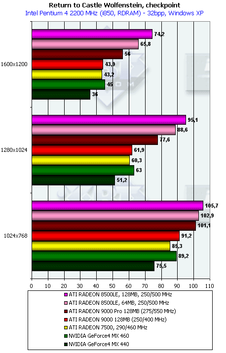 - Return to Castle Wolfenstein (MultiPlayer) (id Software/Activision) — OpenGL, мультитекстурирование, Checkpoint-demo, настройки тестирования — все на максимально возможном уровне, S3TC OFF, конфигурации можно скачать тут