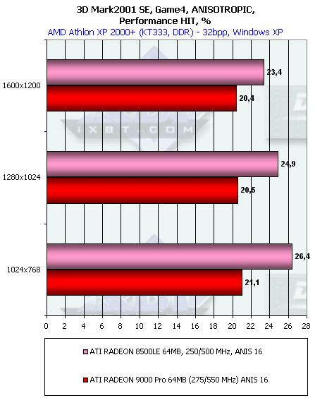 Этот тест, уже не обладая достаточной сложностью в плане геометрии, дал возможность исследуемой ныне карте догнать RADEON 8500, а при разгоне даже перегнать его. А вот наличие всего 4-х текстурников, а также неумение этой игры работать более, чем с двумя текстурами, привели к тому, что падение скорости при анизотропии у RADEON 9000 весьма велико.