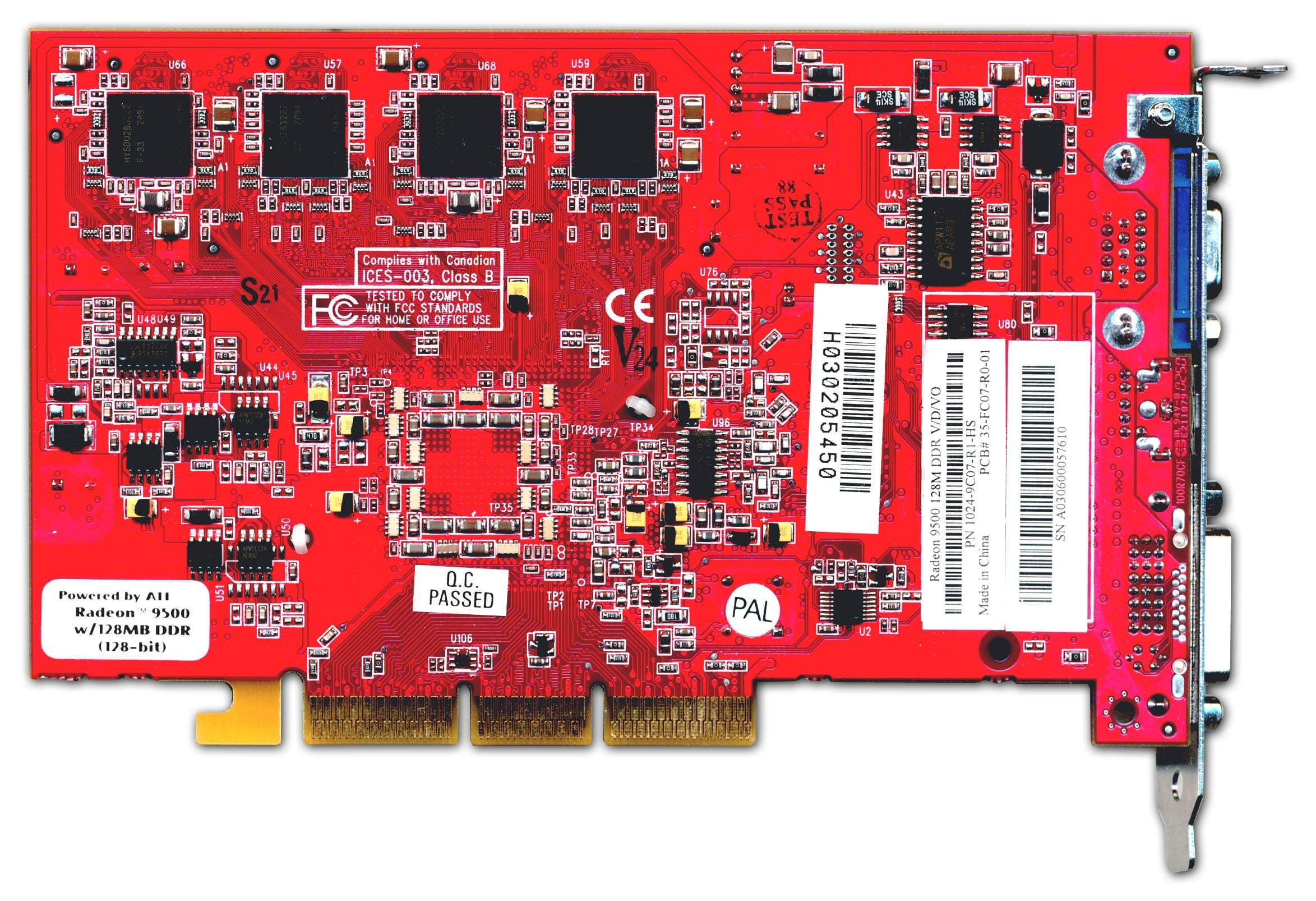 | Карта основана на интерфейсе AGP X2/4/8, имеет 128 мегабайт памяти DDR SDRAM, расмещенной в 8-ми микросхемах по обеим сторонам PCB. Интерфейс обмена с памятью — 128бит. Память изготовлена Hynix, время выборки 3.3 ns, что соответствует частоте работы примерно 300 (600) МГц, но микросхемы тактуются на 270 (540) МГц. Ядро функционирует на стандартной для RADEON 9500 частоте 275 МГц, имея активных 4 конвейера рендеринга. | ![]() |