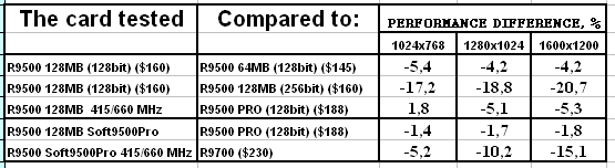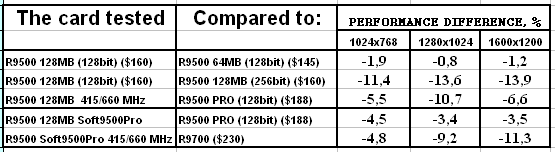 - Разгон переделанной в RADEON 9500 PRO карты оказал очень существенное влияние на скорость, которая иногда достигала уровня RADEON 9700!