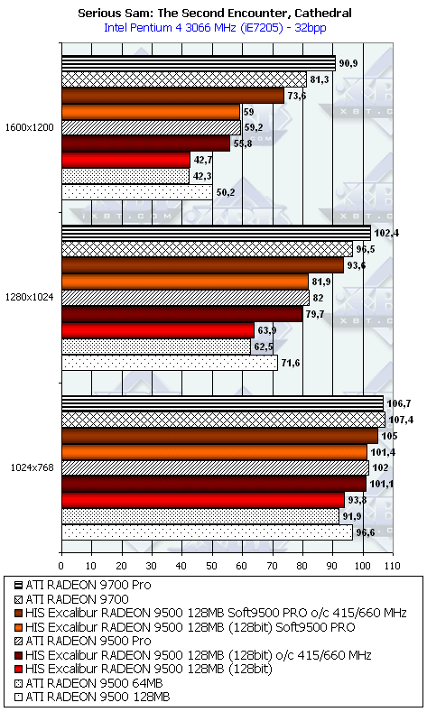 - Serious Sam: The Second Encounter v.1.05 (Croteam/GodGames) — OpenGL, мультитекстурирование, Grand Cathedral demo, настройки тестирования: quality, S3TC OFF