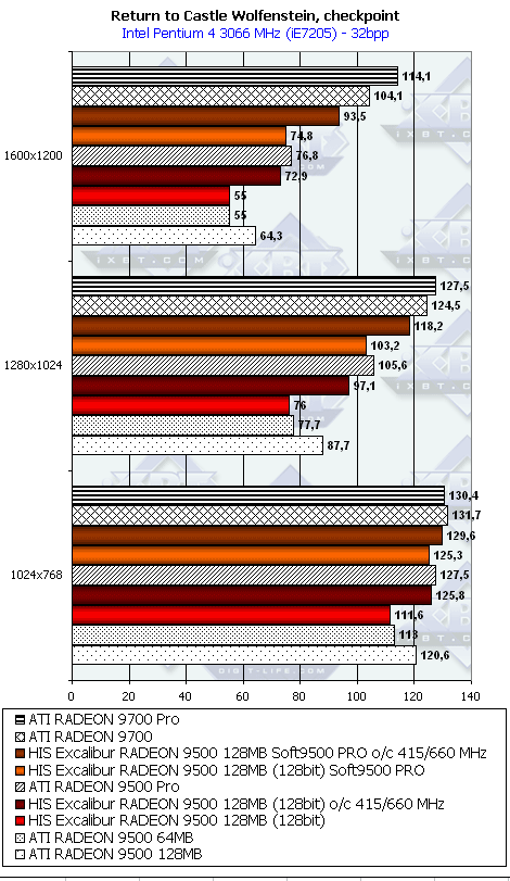 - Return to Castle Wolfenstein (MultiPlayer) (id Software/Activision) — OpenGL, мультитекстурирование, Checkpoint-demo, настройки тестирования — все на максимально возможном уровне, S3TC OFF, конфигурации можно скачать тут