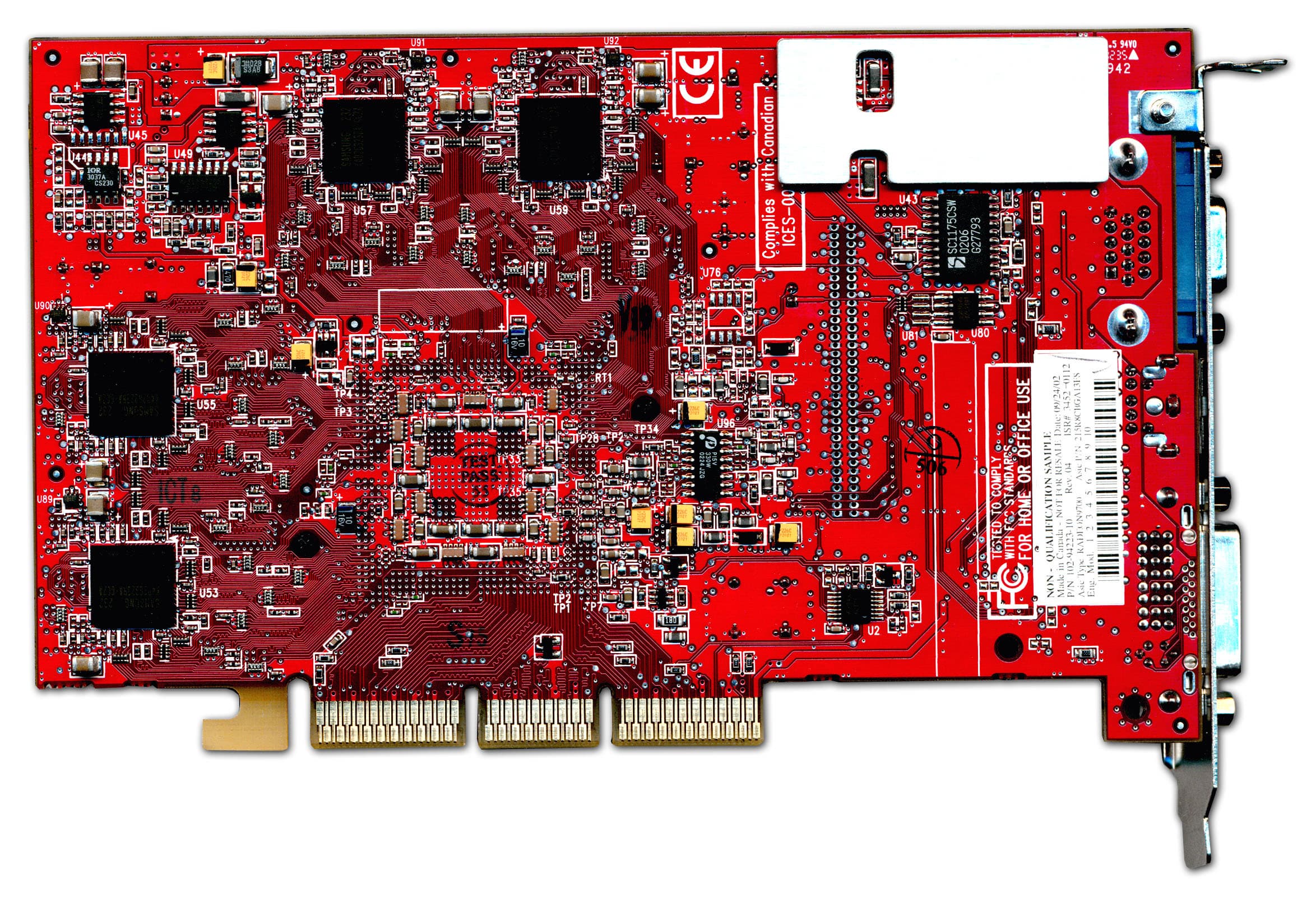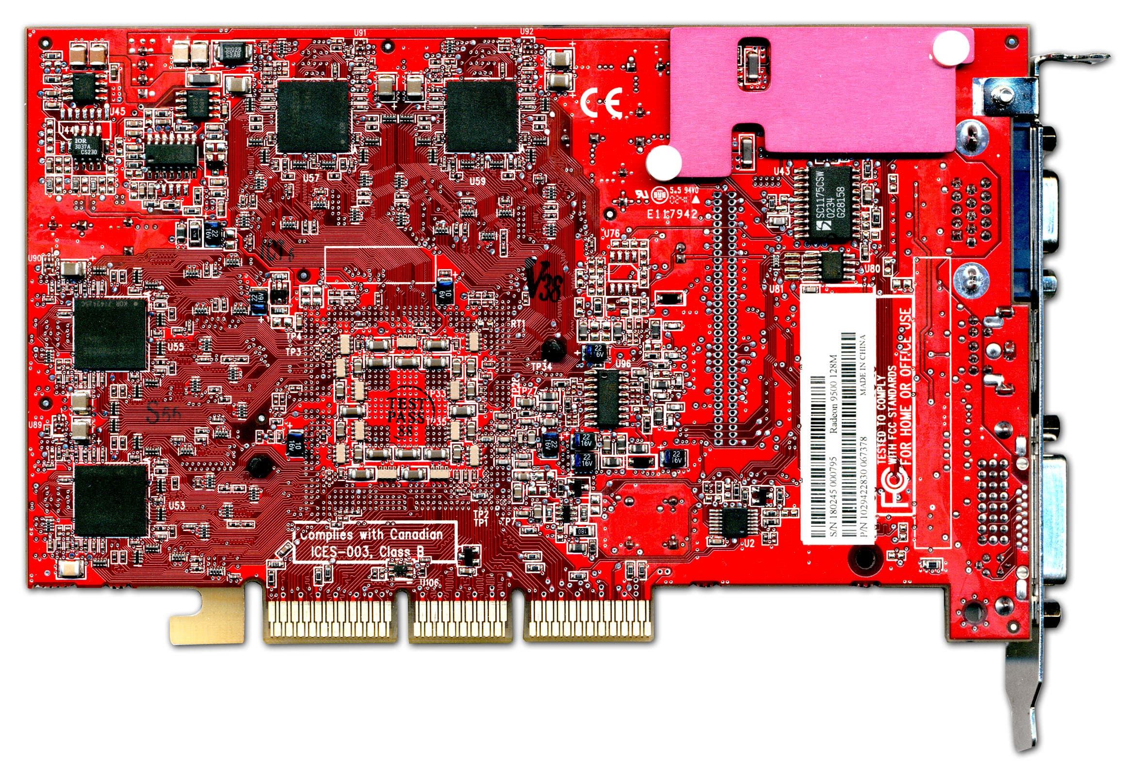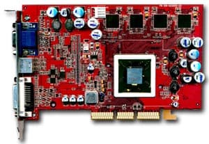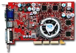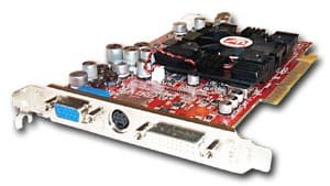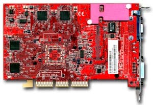 | Карта имеет интерфейс AGP x8/x4, 128 МБ памяти DDR SDRAM, размещенной в 8-ми микросхемах на обеих сторонах PCB. Микросхемы памяти производства Samsung (но все последние карты снабжены модулями от Hynix). Время выборки у микросхем памяти 2,8 ns, что соответствует частоте работы 357 (714) МГц, однако все последние карты имеют микросхемы со временем выборки 3.6 ns, что соответствует частоте 275 (550) МГц. Память же тактуется стандартными значениями частот — 270 (540) МГц. GPU функционирует также на обычной для R9500 частоте 275 МГц. Шина обмена с памятью — 256 bit (аппаратно). | ![]() |