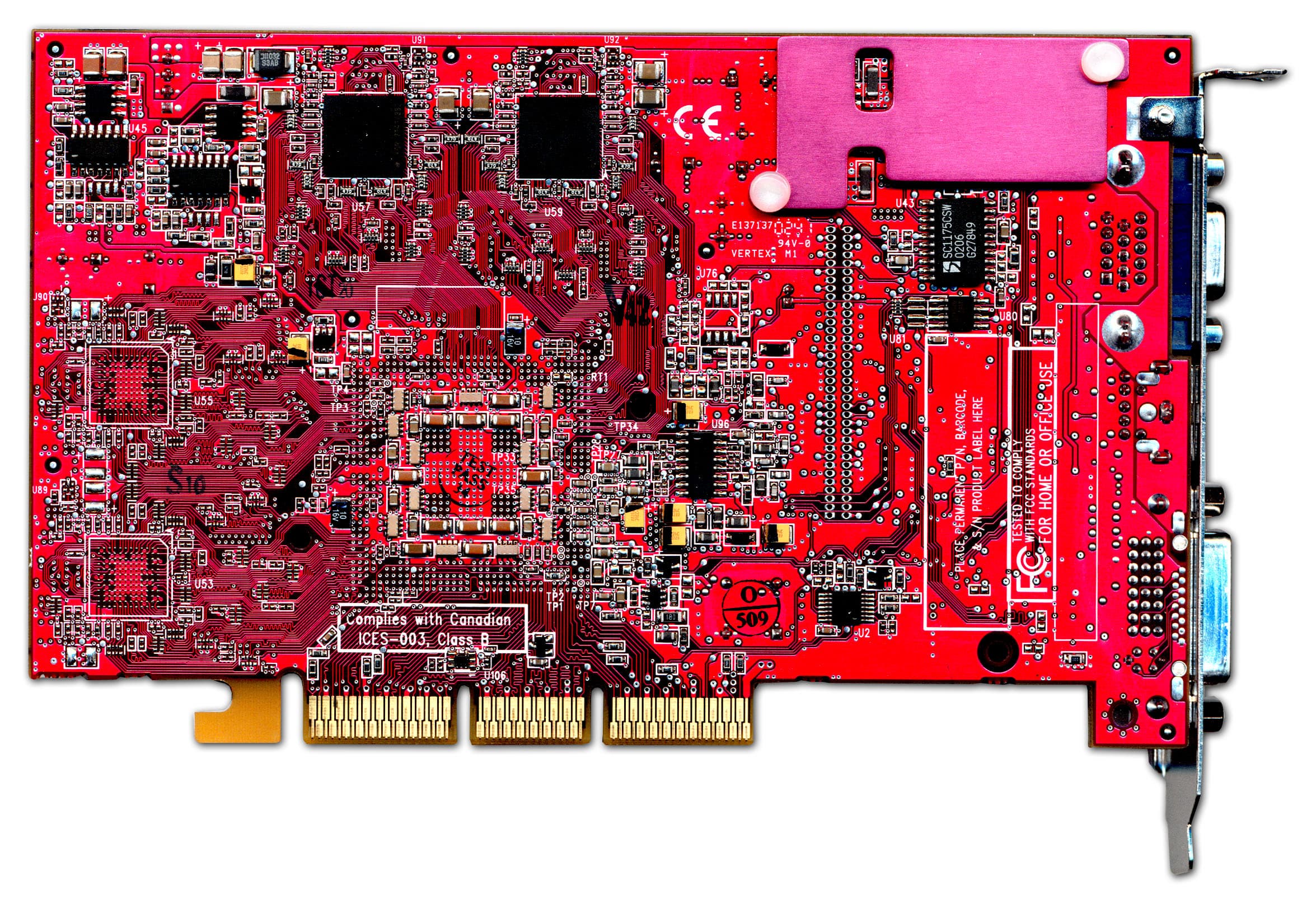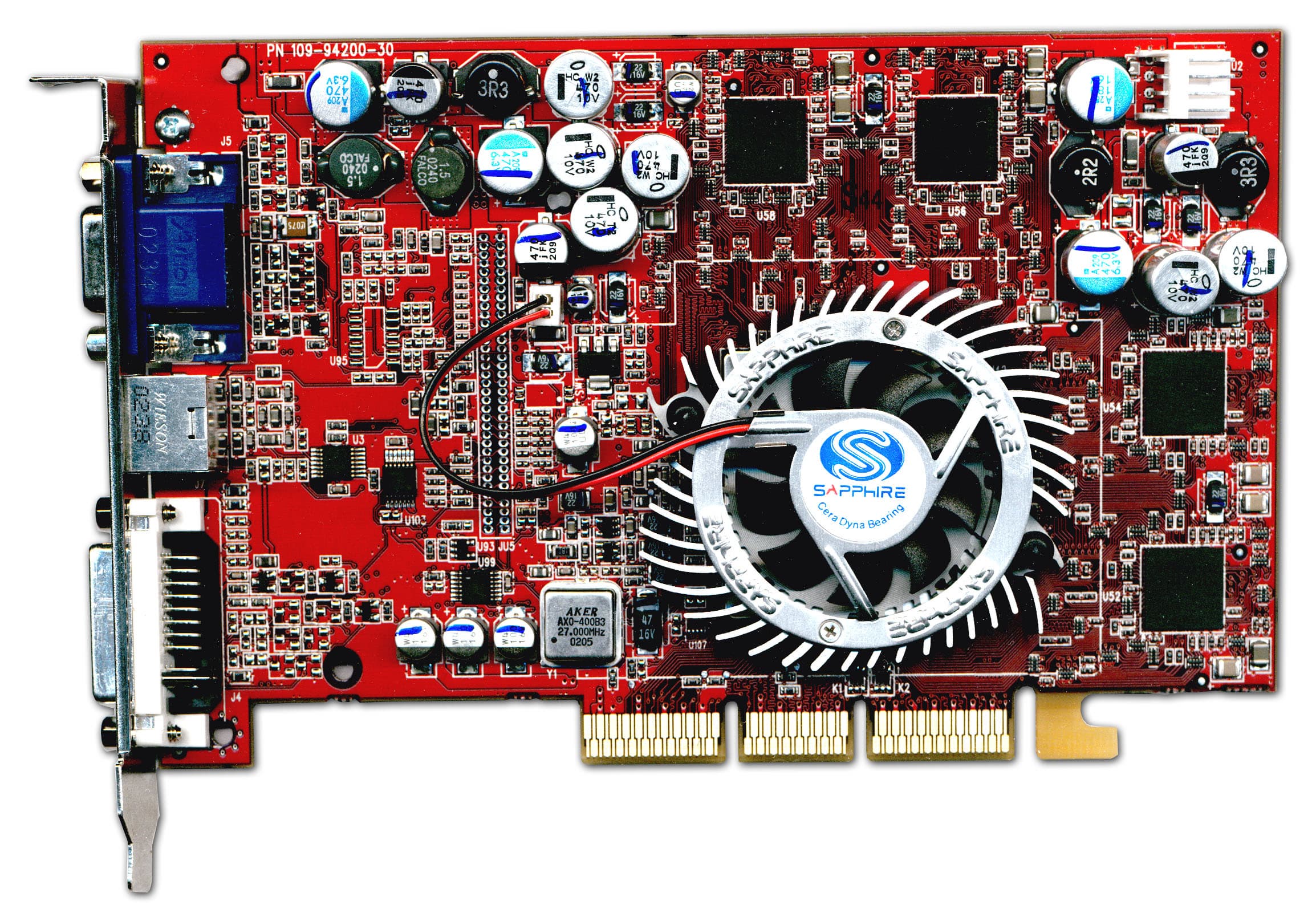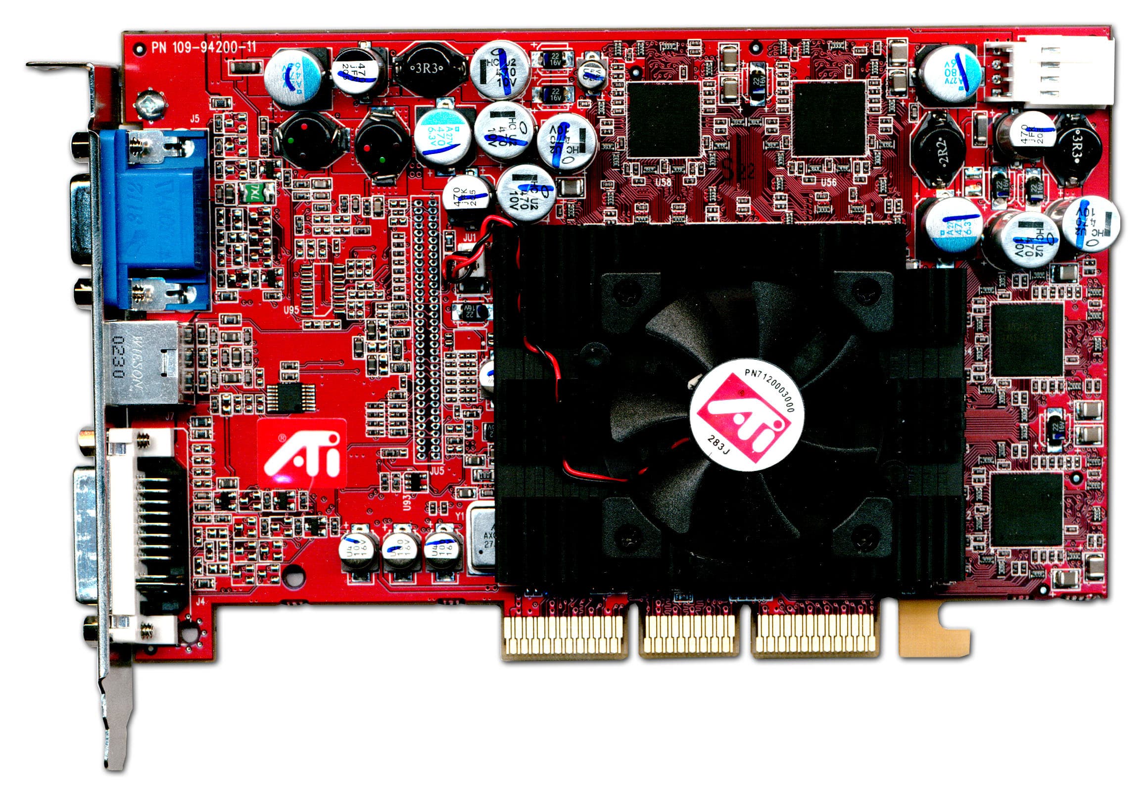 | Карта имеет интерфейс AGP x8/x4, 128 МБ памяти DDR SDRAM, размещенной в 8-ми микросхемах на обеих сторонах PCB. Микросхемы памяти производства Samsung (но все последние карты снабжены модулями от Hynix). Время выборки у микросхем памяти 2,8 ns, что соответствует частоте работы 357 (714) МГц, однако все последние карты имеют микросхемы со временем выборки 3.6 ns, что соответствует частоте 275 (550) МГц. Память же тактуется стандартными значениями частот — 270 (540) МГц. GPU функционирует также на обычной для R9500 частоте 275 МГц. Шина обмена с памятью — 256 bit (аппаратно). | ![]() |