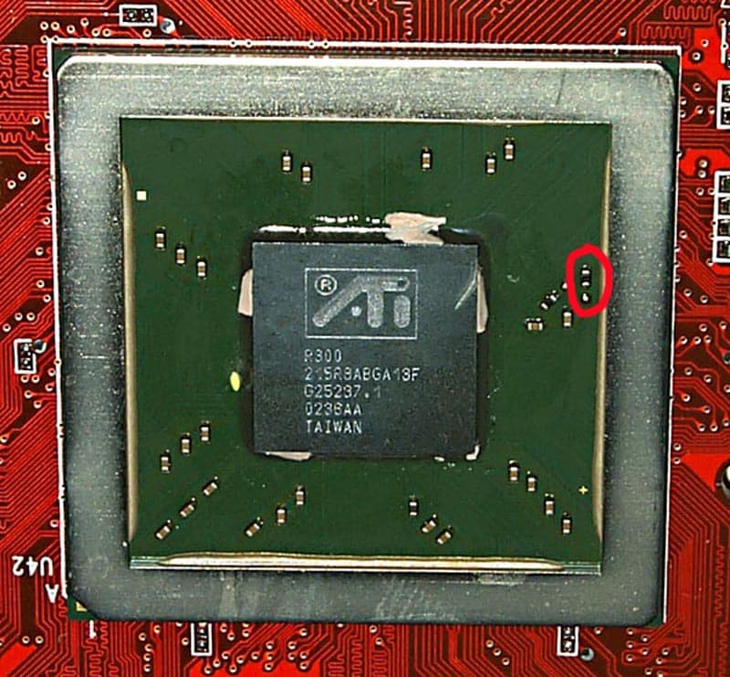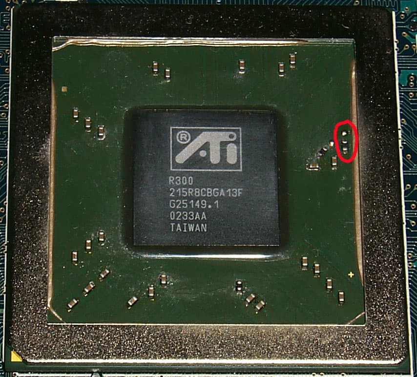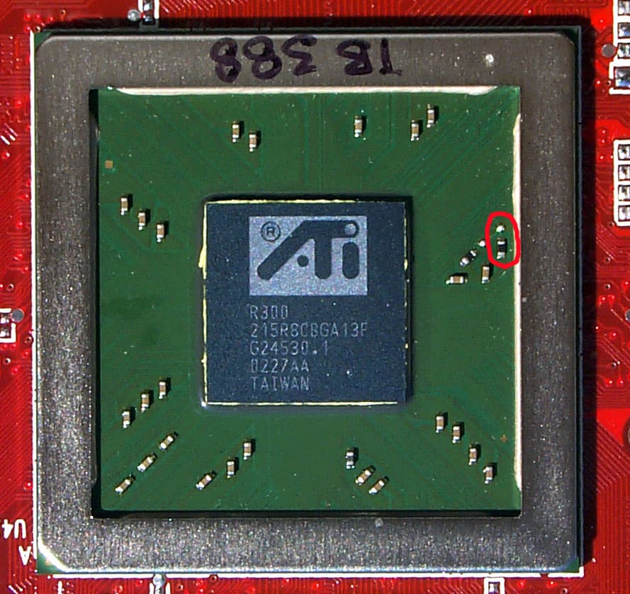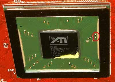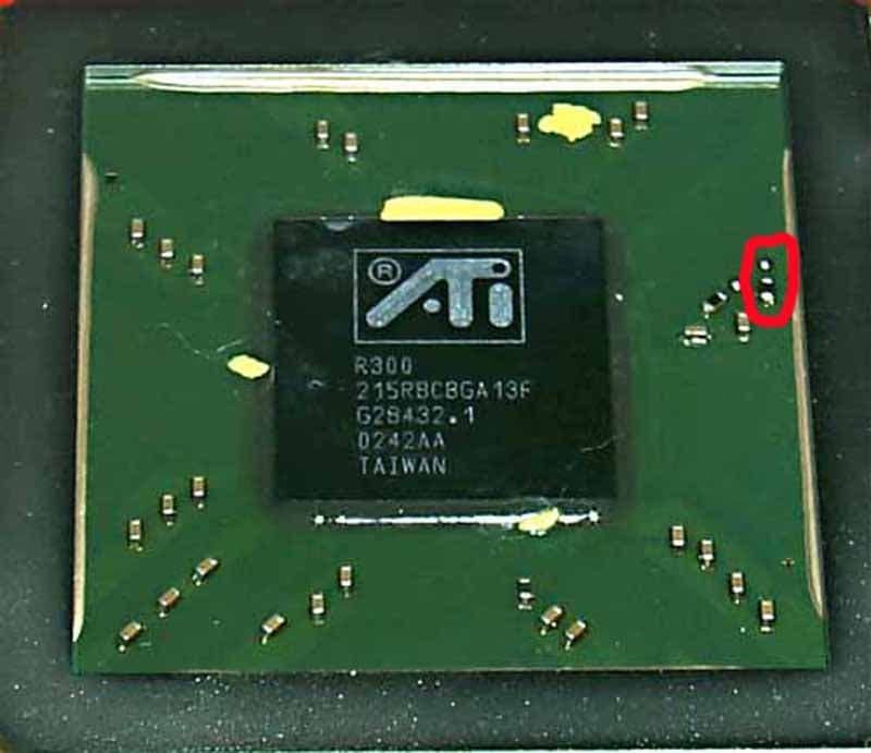 О взаимосвязи аппаратной переделки (перепайки) и программной. У R300 PCI DeviceID программируем через BIOS. У R9500PRO/R9700(PRO) — программируемы и старший и младший байты, поэтому при прошивке на R9500PRO BIOS'а от R9500 драйвер распознаёт карту как R9500 и использует только 4 пиксельных конвейера. У простого R9500 этот самый злополучный резистор на чипе запрещает программирование старшего байта PCI DeviceID, делающий невозможной подмену ID на уровне BIOS. Однако форсировать ID ну уровне драйвера нам ничего не мешает. Что и было сделано.