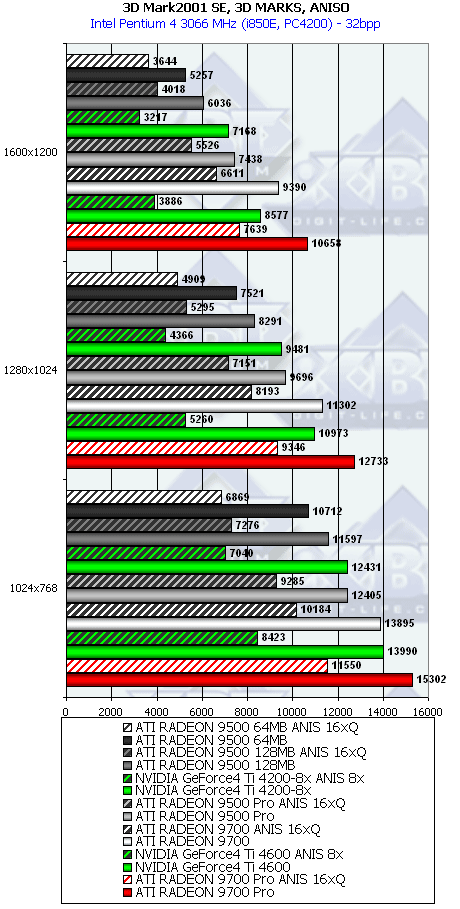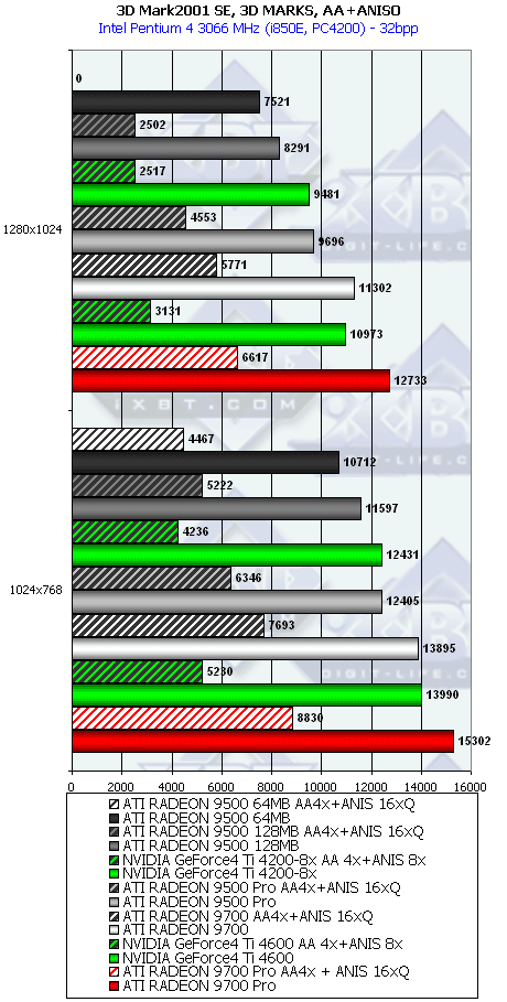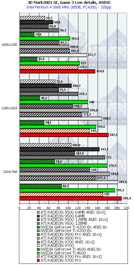 Что мы видим? Сильное поражение R9500 64MB (кроме режима с АА), чуть более отрадную картину у 128-мегового R9500 и очень хорошие результаты у R9500 PRO в режимах с АА и/или анизотропией. Монстры R9700 и R9700PRO успешно сражаются со своим соперником также в тяжелых условиях нагрузки АА и/или анизотропией.
