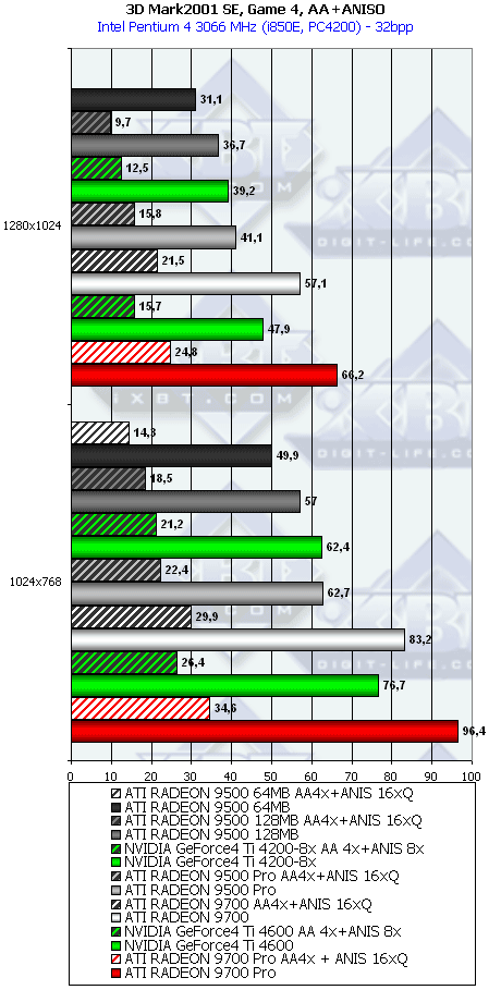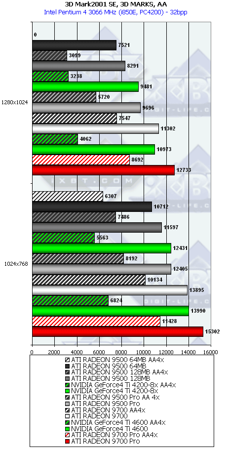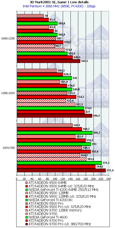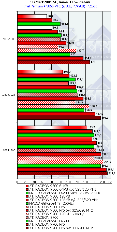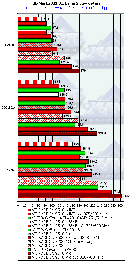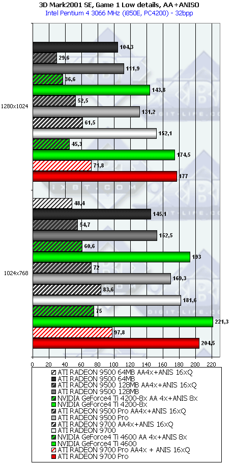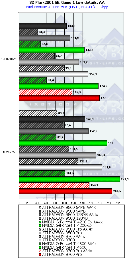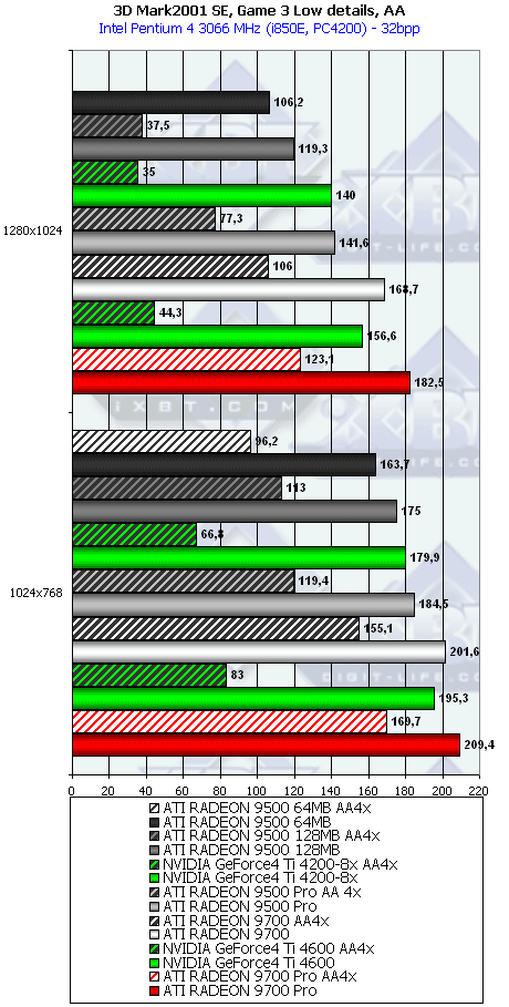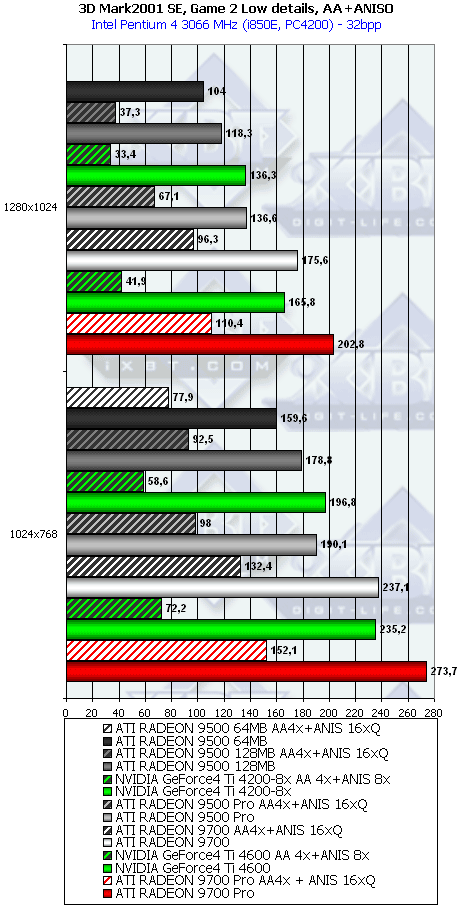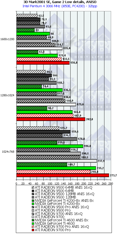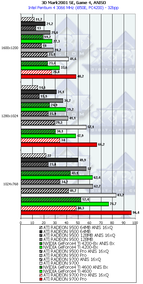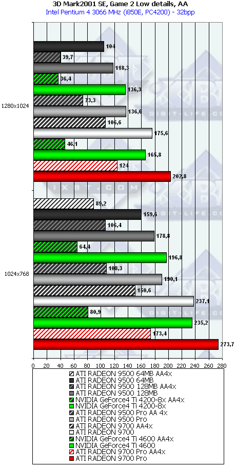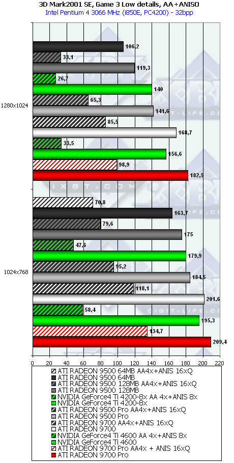 А тут R9500 64MB проявил себя лучше, и хотя без АА и анизотропии все еще есть сильный проигрыш, но надо учитывать и разницу в цене, а также прекрасную победу при включенных АА и анизотропке. Разумеется, у R9500 128MB все еще радужнее. Да и в целом этот тест для всей линейки очень отраден.