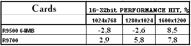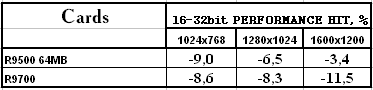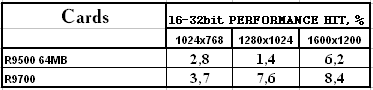 Интересно отметить, что R9500 64MB (128bit) — более сбалансированная карта, для ее 4-х конвейеров рендеринга вполне хватает такой шины, если не использовать АА или анизотропию. А вот у R9700, несмотря на 256-битную шину, падение скорости при переходе из 16 в 32бита имеется, то есть 8-ми конвейерам, работающим на 275 МГц, требуется чуть более быстрая память.