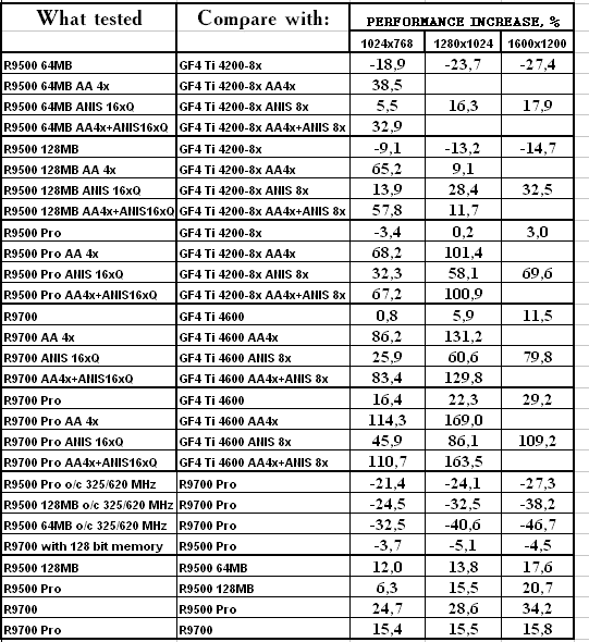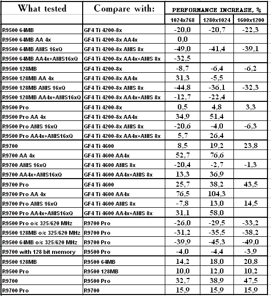 Перед анализом дам некоторую информацию. Автор RivaTuner-а, Алексей Николайчук (AKA Unwinder), помог модифицировать работу RADEON 9700, урезав шину до 128бит (то есть, по сути получив почти RADEON 9500 PRO). Тесты такой карты будут также представлены, и малая разница между R9700 128bit и R9500 PRO ярко еще раз доказывает наличие 128-битной шины у последнего.