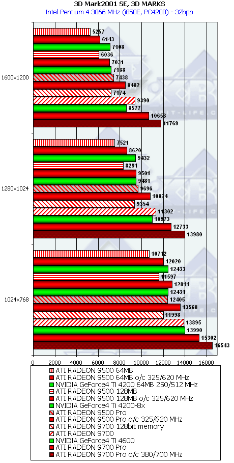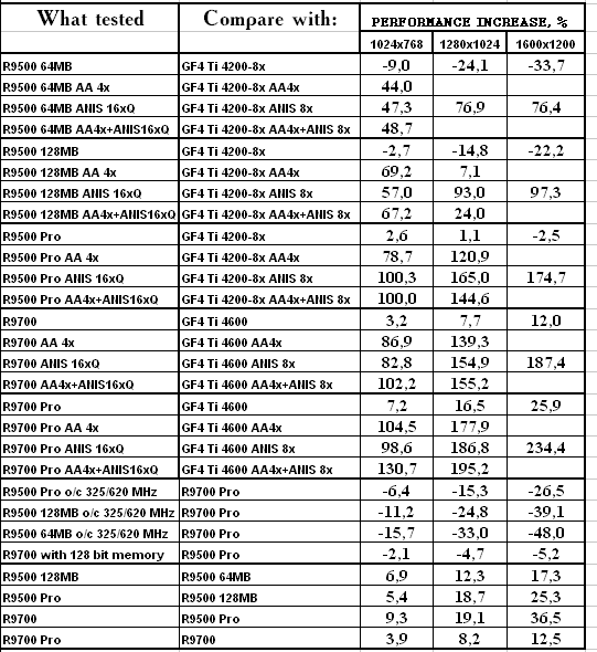 Сравнение с конкурентами из "стана NVIDIA" велось в жестком для карт от ATI режиме: всем, кроме, R9700 и R9700PRO, противопоставлялась плата на базе GeForce4 Ti 4200-8x, имеющая на начало 2003 года цену около $200 (то есть, RADEON 9500 64 и 128MB стОят дешевле). R9700 и 9700PRO соперничают с Ti 4600 (что логично, ибо в первом случае цены схожи, а во втором — просто не с кем больше соперничать).