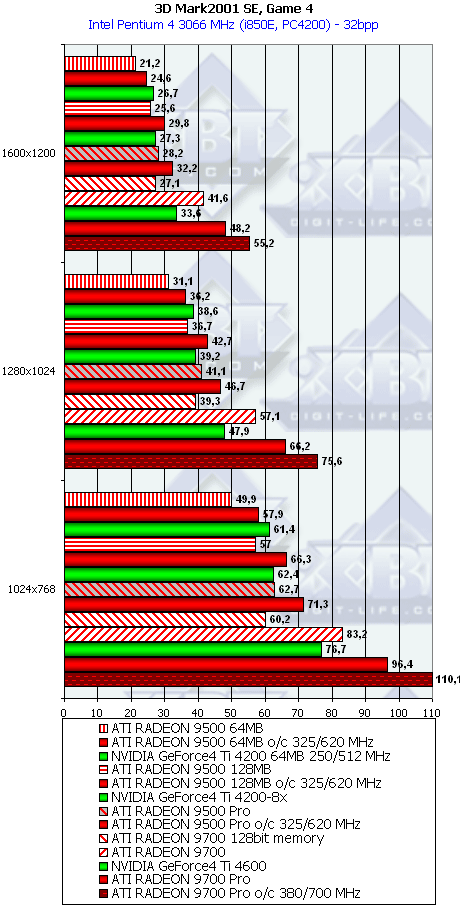 Также прошу обратить внимание на тесты 4-х из 5-ти карт на частотах 325/310 МГц, то есть на частотах работы RADEON 9700 PRO. Из этих сравнений можно увидеть, как влияет на результаты шина обмена с памятью, а также урезанность самого ядра (4 или 8 конвейеров).