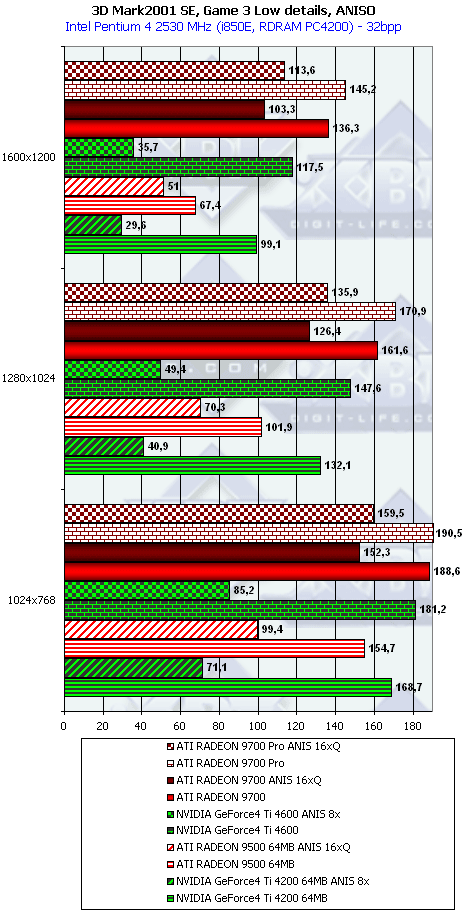 Мы видим великолепные результаты у RADEON 9700 и намного лучшие у RADEON 9500, который, правда, проигрывает без АА и анизотропии, но при активизации любой из этих функций перевес на его стороне.