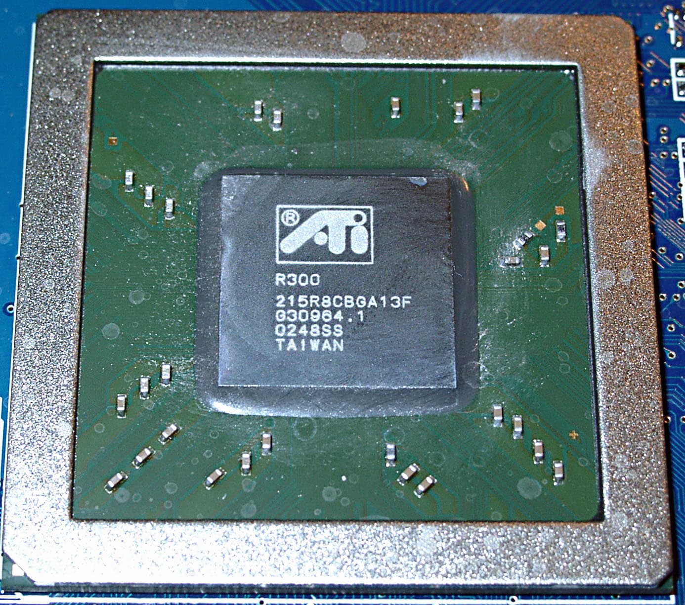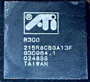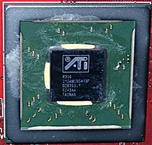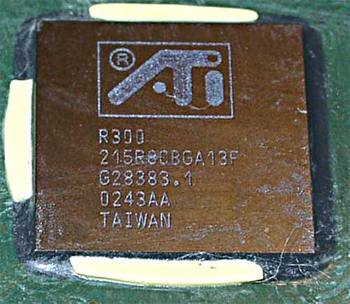 Обратите внимание на снимки чипа на карте от Hercules. Как только я снял кулер, то сразу же увидел маленькую выщербину на кристалле. Думаю, что владельцы процессоров Athlon сразу поняли, о чем речь. Да, именно о том, что кристаллы и у R300 весьма нежные. Слава Богу, что данный дефект поверхности не стал фатальным, и карта работает хорошо.