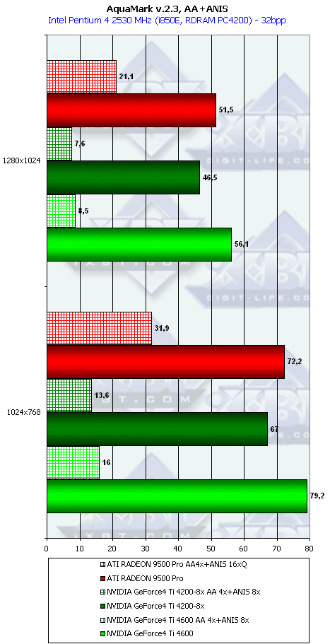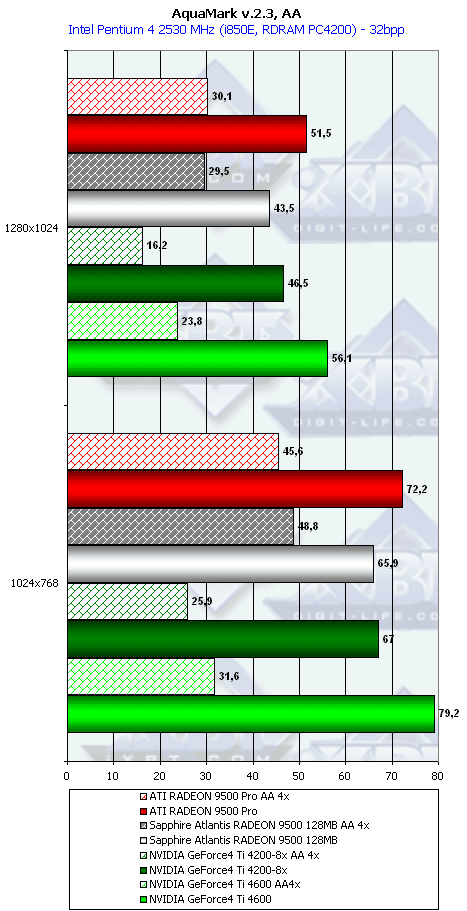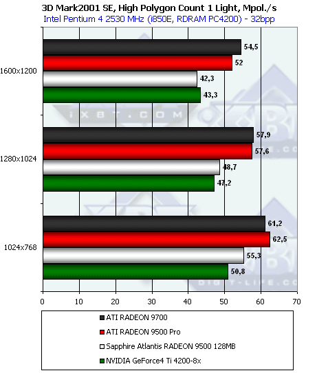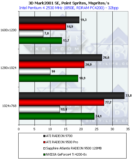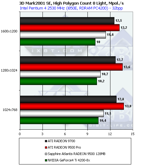 Интересно, что в отношении скорости работы с освещением разработчики ATI «недоглядели», и RADEON 9500 PRO обходит даже своего старшего и более мощного собрата — RADEON 9700. Странно, да? Ведь согласно обещаниям ATI, чипы у того и другого идентичны. Опять косвенная улика того, что регулировка работы чипа программная, и «палачи» просто всех нюансов не усмотрели.