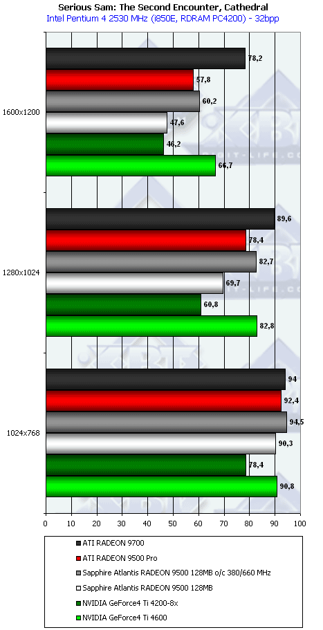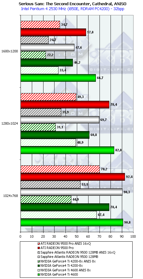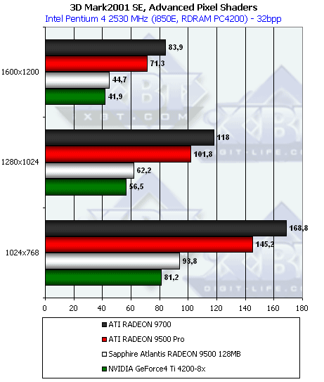 А здесь все вроде логично, как и должно быть. Отметим, что все семейство RADEON 9500 быстрее обрабатывает такой вид бампинга, чем Ti 4200.