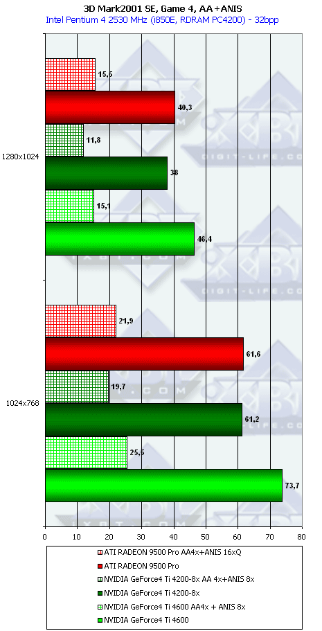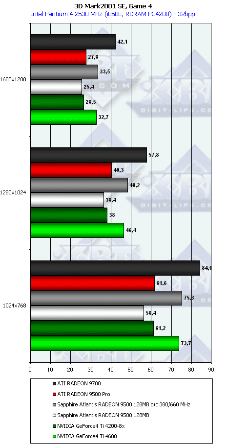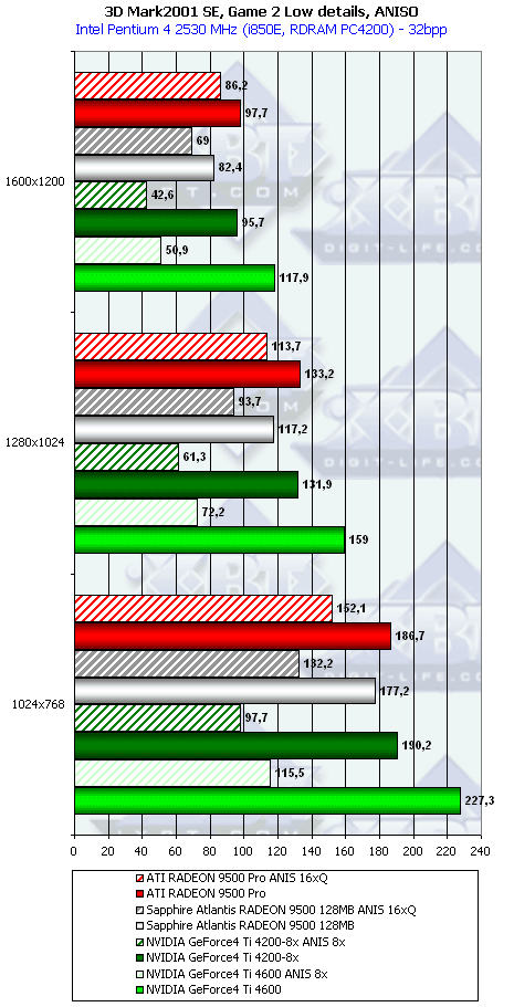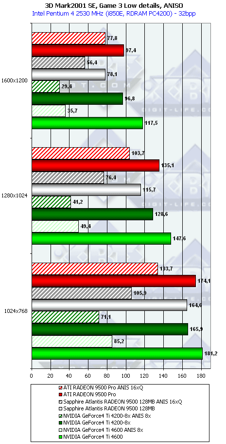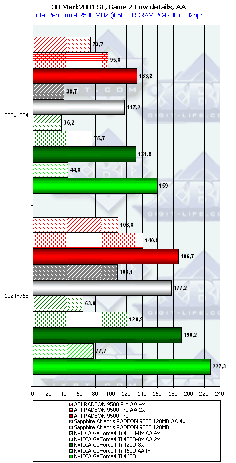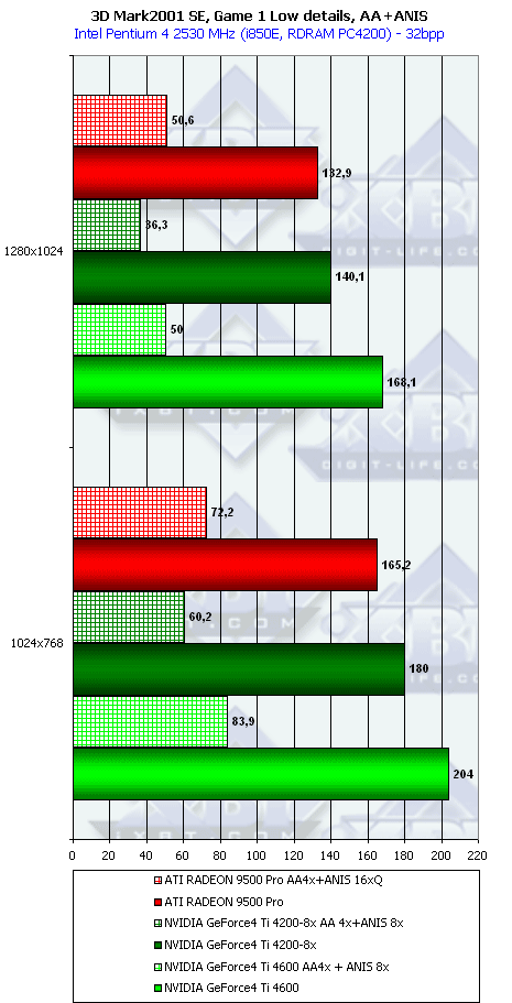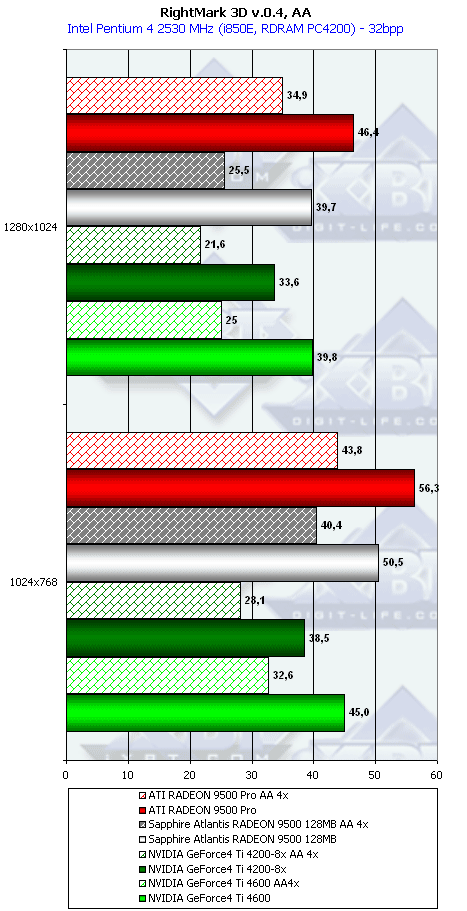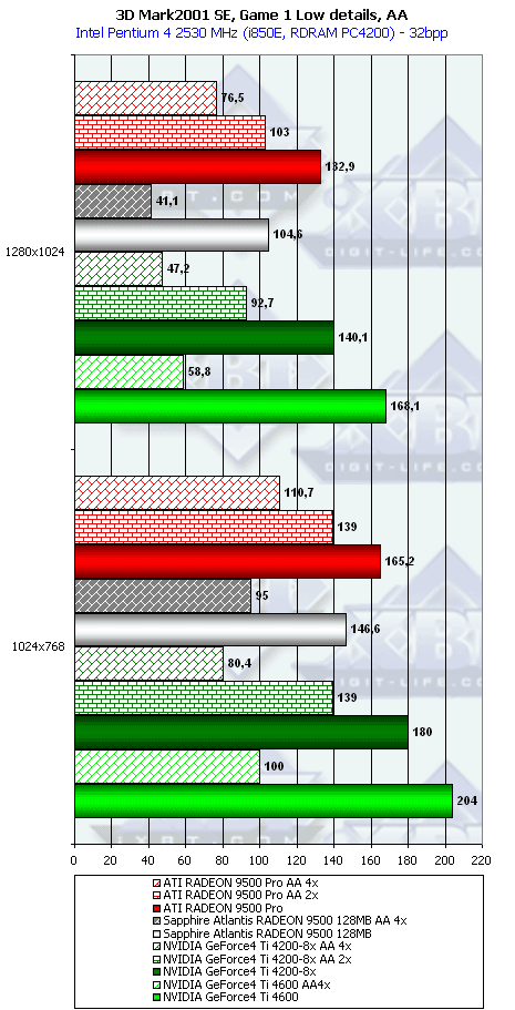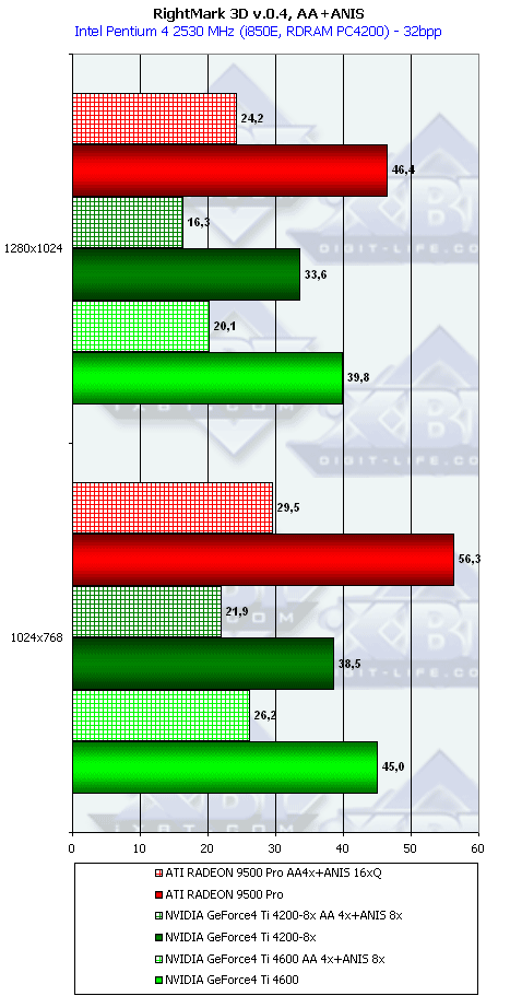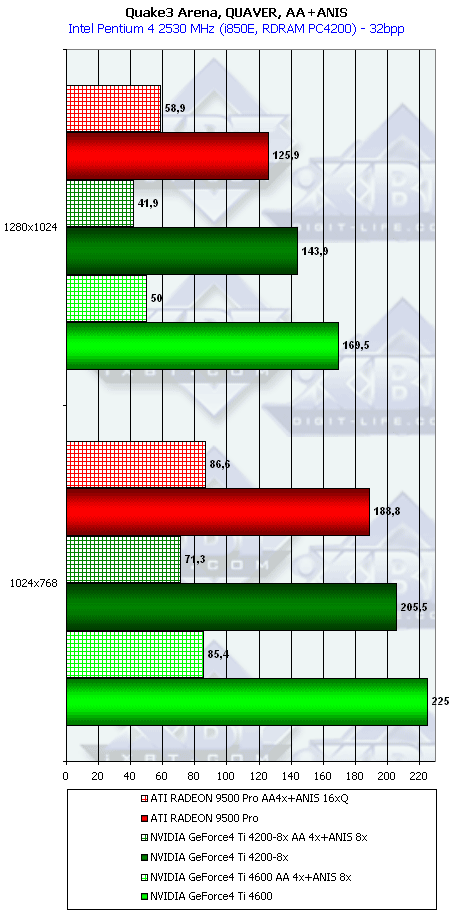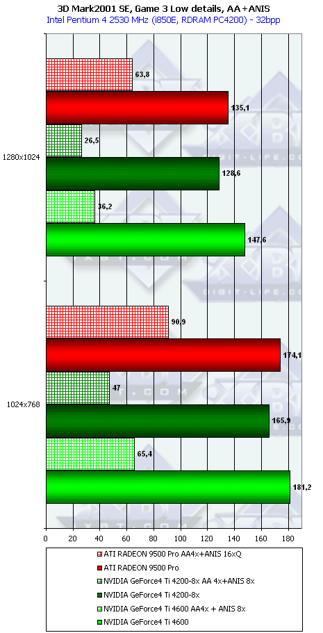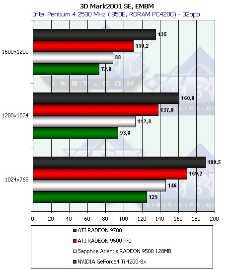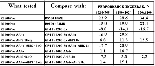 Ну что тут можно сказать? RADEON 9500 PRO прочно занимает свое место между GeForce4 Ti 4200-8x и Ti 4600, а в тяжелых режимах часто кладет на лопатки и Ti 4600. Неплохо для карты за $200?