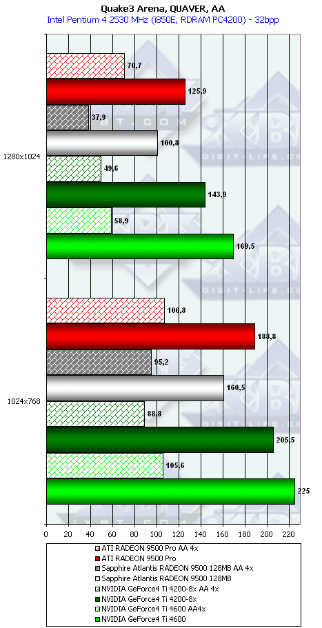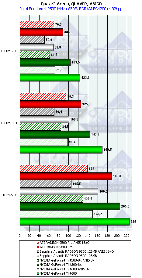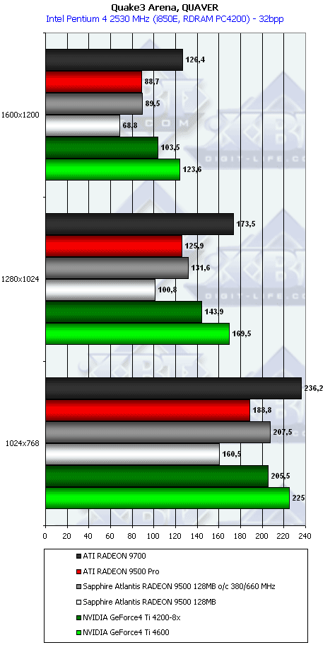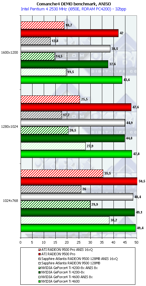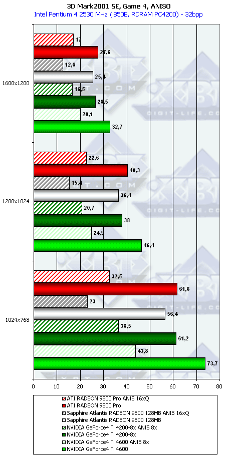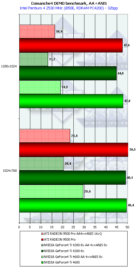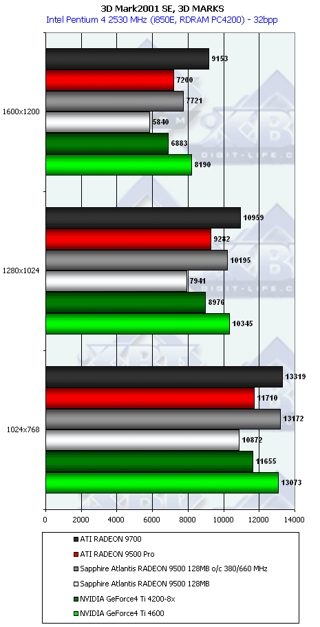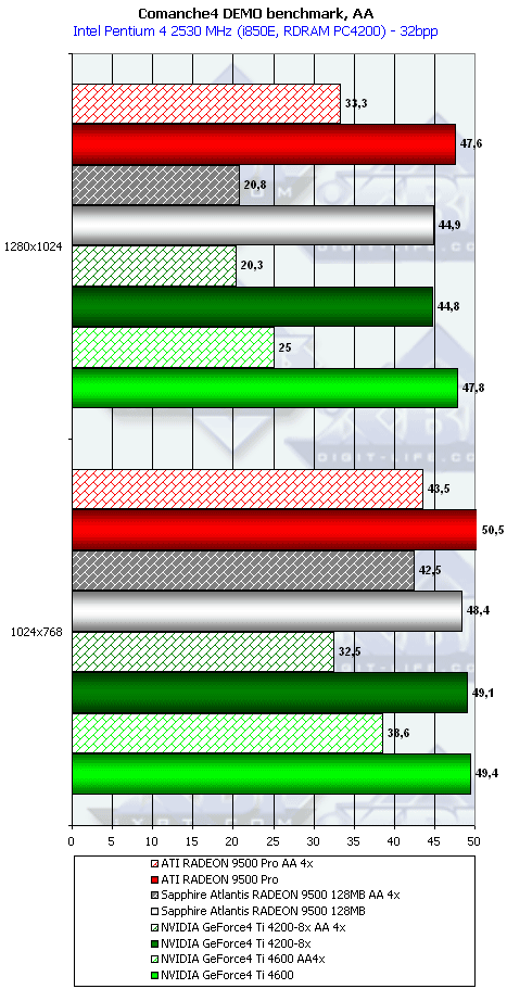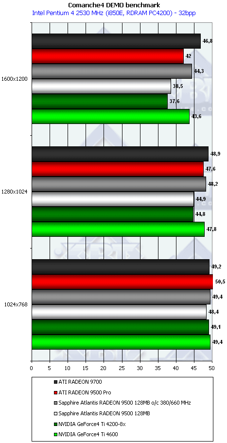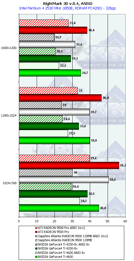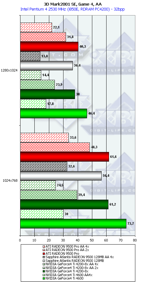 Ну что тут можно сказать? RADEON 9500 PRO прочно занимает свое место между GeForce4 Ti 4200-8x и Ti 4600, а в тяжелых режимах часто кладет на лопатки и Ti 4600. Неплохо для карты за $200?