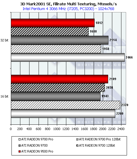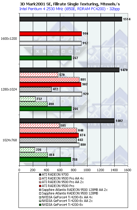 А вот в режиме мультитекстурирования различия между 9500 и 9500 PRO очевидны. О чем это говорит? О том, что у 9500 — 4 конвейера и 4 текстурника. А у 9500 PRO текстурников видимо 8.