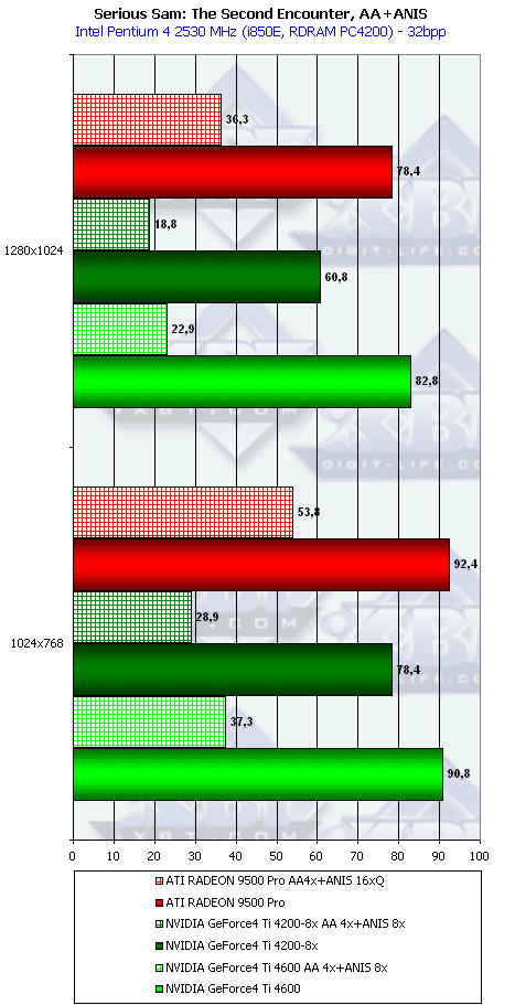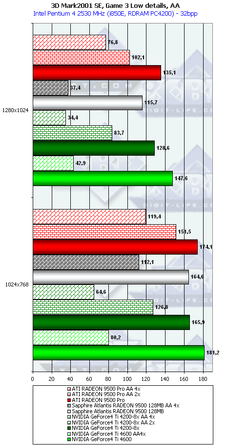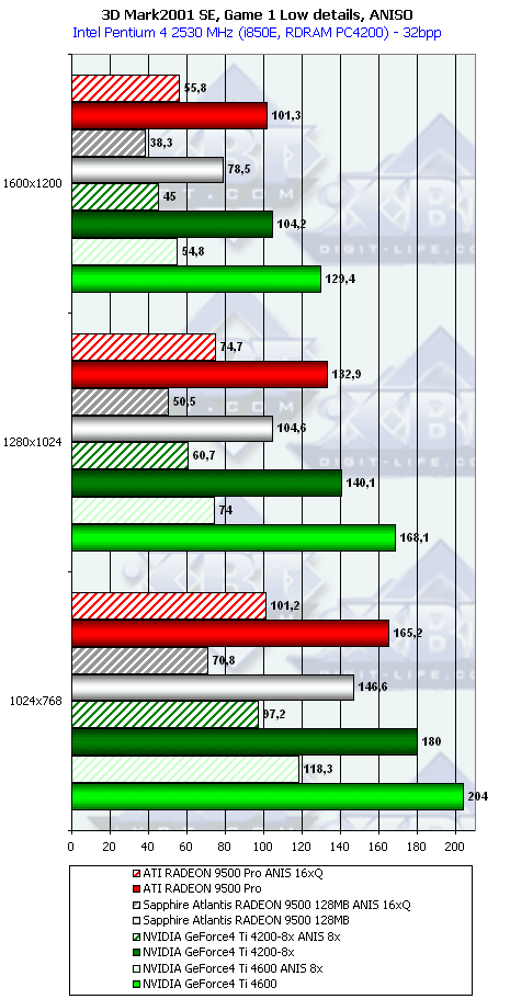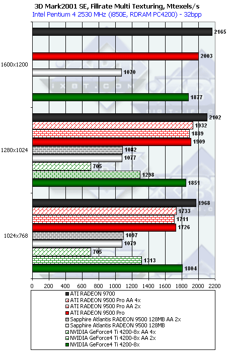 Победа RADEON 9500 над Ti 4200 вполне логична (4 пиксельных конвейера, работающих на более высокой частоте), а вот более высокая скорость RADEON 9500 PRO снова говорит о том, что текстурников у него 8.