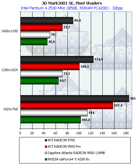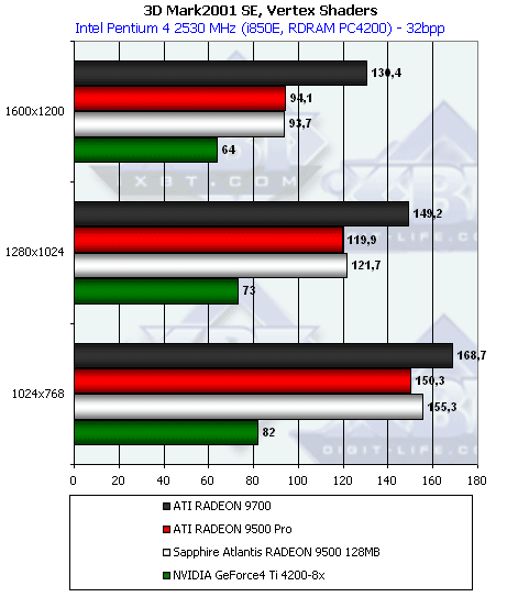 Здесь очевидна победа RADEON 9500/PRO над соперником от NVIDIA, что дает основания полагать, что у 9500 и 9500 PRO все 4 вершинных конвейера либо оставлены без урезаний, но хитро заторможены относительно RADEON 9700, либо, для исполнения шейдеров используется только часть конвейеров, в то время как для эмуляции TCL (см. ранее тест на геометрическую производительность) используется полный набор блоков.