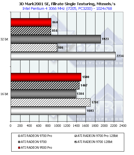 Осталось объяснить равные результаты 9500 и 9500 PRO в тесте Fillrate. Все дело в ограниченой пропускной способности 128 бит шины — она просто физически не может записать более четырех 32 битных значений за такт. Для того чтобы подтвердить это предположение, мы прогнали Fillrate тест в 16 битном цвете. И точно (см. диаграммы) теперь различие между 4 конвейерами RADEON 9500 и 8 конвейерами RADEON 9500 PRO заметно. Шина в 128 бит достаточна для записи сразу восьми 16 битных значений цвета за такт.
